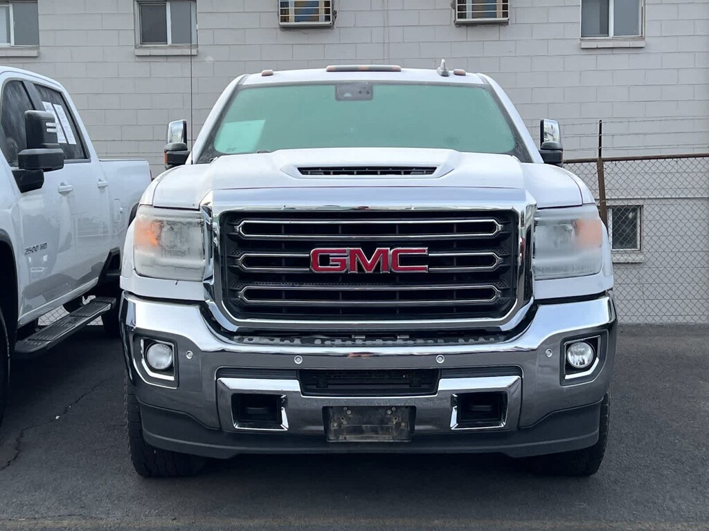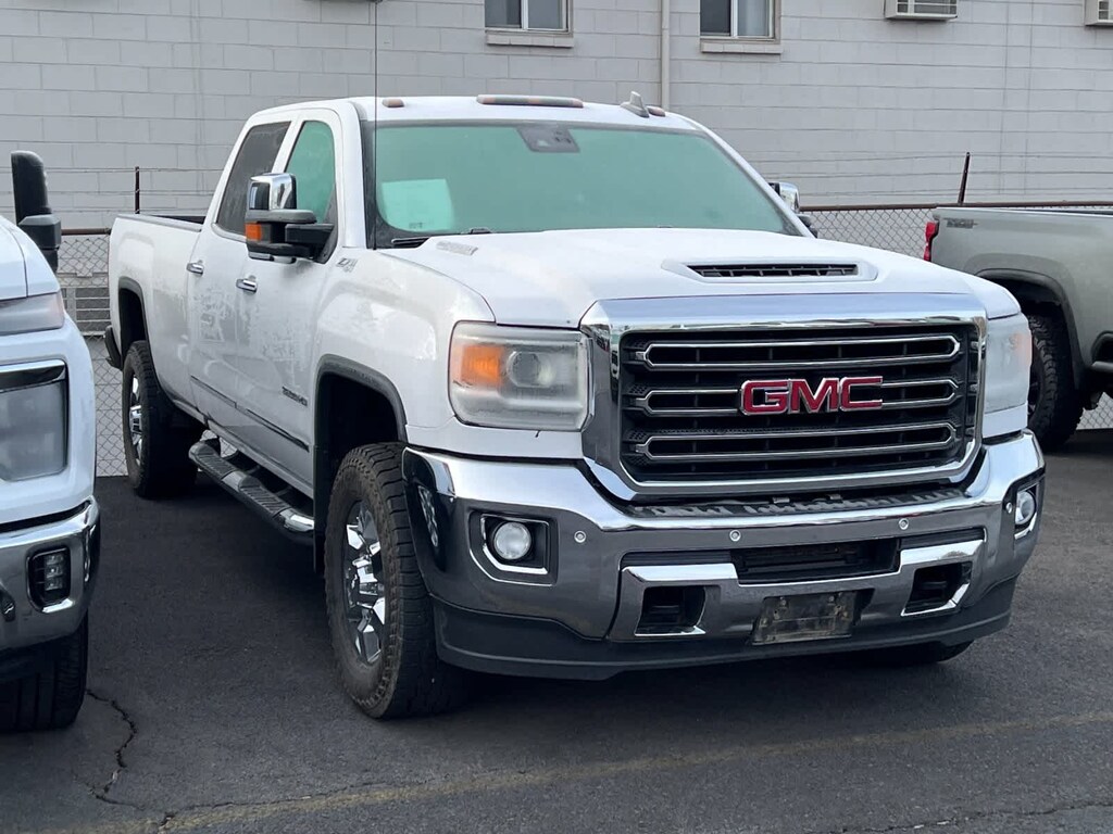 White Frost Tricoat 2019 GMC Sierra 3500HD SLT 4WD Allison 1000 6-Speed Automatic Duramax 6.6L V8 Turbodiesel Allison 1000 6-Speed Automatic, 4WD, Cocoa/Dune Leather.
