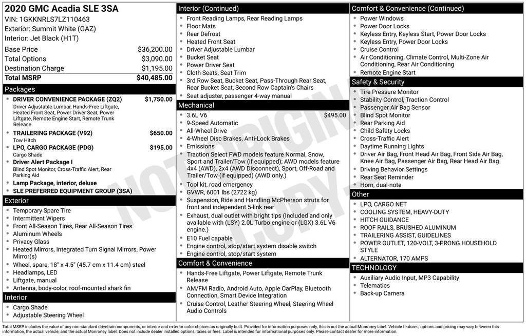 2020 GMC Acadia SLE Is nicely equipped with Cargo Package (LPO) (Cargo Net and Retractable Cargo Shade), Driver Convenience Package (120-Volt Power Outlet, 8-Way Power Driver Seat Adjuster, Brushed Aluminum Roof Rails, Hands Free Power Programmable Liftgate, Heated Driver & Front Passenger Seats, Power Driver Lumbar Control Seat Adjuster, and Remote Start), Preferred Equipment Group 3SA, Trailering Package (170 Amp Alternator, Heavy-Duty Cooling System, Hitch Guidance, and Trailering Assist Guidelines), AWD, Jet Black Cloth, 3rd row seats: split-bench, 4-Way Manual Driver Seat Adjuster, 4-Way Manual Passenger Seat Adjuster, 4-Wheel Disc Brakes, 6 Speakers, 6-Passenger (2-2-2 Seating Configuration), 6-Speaker Audio System Feature, 7-Passenger (2-3-2 Seating Configuration), ABS brakes, Air Conditioning, Alloy wheels, AM/FM radio: SiriusXM, Apple CarPlay/Android Auto, Auto High-beam Headlights, Automatic temperature control, Brake assist, Bumpers: body-color, Compass, Delay-off headlights, Driver door bin, Driver vanity mirror, Dual front impact airbags, Dual front side impact airbags, Electronic Stability Control, Emergency communication system: OnStar and GMC connected services capable, Four wheel independent suspension, Front anti-roll bar, Front Bucket Seats, Front Center Armrest, Front dual zone A/C, Front reading lights, Fully automatic headlights, Heated door mirrors, Illuminated entry, Knee airbag, Low tire pressure warning, Occupant sensing airbag, Outside temperature display, Overhead airbag, Overhead console, Panic alarm, Passenger door bin, Passenger vanity mirror, Power door mirrors, Power steering, Power windows, Premium audio system: GMC Infotainment System, Premium Cloth Seat Trim, Radio data system, Radio: AM/FM w/8" Diagonal Multi-Touch Display, Rear air conditioning, Rear anti-roll bar, Rear reading lights, Rear seat center armrest, Rear window defroster, Rear window wiper, Remote keyless entry, Security system, SiriusXM Radio, Speed control, Speed-sensing steering, Split folding rear seat, Spoiler, Steering wheel mounted audio controls, Tachometer, Telescoping steering wheel, Tilt steering wheel, Traction control, Trip computer, Turn signal indicator mirrors, Variably intermittent wipers, Voltmeter, and Wheels: 18" Machined Aluminum w/Dark Accents.