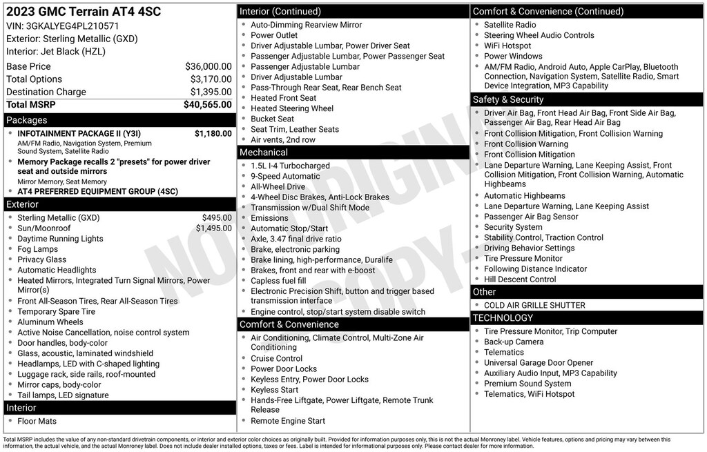 Clean CARFAX. 2023 GMC Terrain AT4 Is nicely equipped with Infotainment Package II (Radio: GMC Infotainment Audio System w/Navigation, Premium 7-Speaker Bose Sound System w/Amplifier, and SiriusXM Radio), Preferred Equipment Group 4SC, AWD, 2 USB Data Ports, 2 USB Data Ports w/SD Card Reader, 3.47 Axle Ratio, 4-Wheel Disc Brakes, 6 Speakers, 6-Speaker Audio System Feature, 6-Way Power Front Passenger Seat, 8-Way Power Driver Seat Adjuster, ABS brakes, Air Conditioning, Alloy wheels, AM/FM radio: SiriusXM, Auto High-beam Headlights, Auto-dimming Rear-View mirror, Automatic temperature control, Bluetooth® For Phone, Brake assist, Bumpers: body-color, Cold Air Grille Shutter, Compass, Delay-off headlights, Driver & Front Passenger Heated Seats, Driver door bin, Driver vanity mirror, Dual front impact airbags, Dual front side impact airbags, Electronic Stability Control, Emergency communication system: OnStar and GMC connected services capable, Four wheel independent suspension, Front anti-roll bar, Front Bucket Seats, Front Center Armrest, Front dual zone A/C, Front fog lights, Front Passenger 2-Way Power Lumbar, Front reading lights, Fully automatic headlights, Garage door transmitter, Heated door mirrors, Heated front seats, Heated steering wheel, Illuminated entry, Lane Departure Warning System, Low tire pressure warning, Memory seat, Occupant sensing airbag, Outside temperature display, Overhead airbag, Overhead console, Panic alarm, Passenger door bin, Passenger vanity mirror, Perforated Leather-Appointed Seat Trim w/AT4 Logo, Power door mirrors, Power Driver Lumbar Control, Power driver seat, Power Liftgate, Power passenger seat, Power steering, Power windows, Radio data system, Radio: GMC Infotainment Audio System w/8" Display, Rear anti-roll bar, Rear seat center armrest, Rear window defroster, Rear window wiper, Remote keyless entry, Roof rack: rails only, Security system, Skyscape Power Sunroof w/Power Sunscreen, Speed control, Speed-sensing steering, Split folding rear seat, Spoiler, Steering wheel mounted audio controls, Tachometer, Telescoping steering wheel, Tilt steering wheel, Traction control, Trip computer, Turn signal indicator mirrors, Variably intermittent wipers, Wheels: 17" x 7" Gloss Black Aluminum, and Wireless Apple CarPlay/Wireless Android Auto.