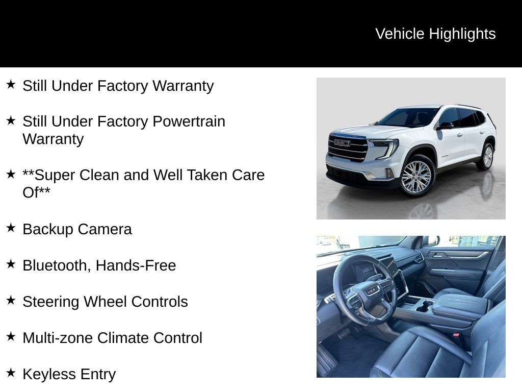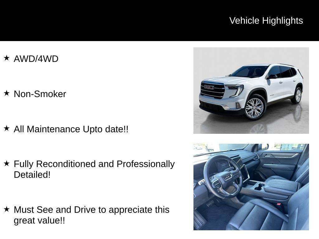 Recent Arrival! 2024 GMC Acadia Elevation Is nicely equipped with Preferred Equipment Group 4SD, AWD, After Dark Cloth, 12 Speakers, 3.49 Final Drive Axle Ratio, 3rd row seats: split-bench, 4-Wheel Disc Brakes, 6-Way Power Front Passenger Seat Adjuster, 7-Passenger Seating (2-2-3 Seating Configuration), 8-Way Power Driver Seat Adjuster, ABS brakes, Air Conditioning, Alloy wheels, AM/FM radio: SiriusXM with 360L, Apple CarPlay/Android Auto, Auto High-beam Headlights, Auto-dimming Rear-View mirror, Automatic temperature control, Bodyside moldings, Bose Performance 12-Speaker System w/Sub-woofer, Brake assist, Bumpers: body-color, Compass, CoreTec Seat Trim, Delay-off headlights, Driver 4-Way Power Lumbar Seat Adjuster, Driver door bin, Driver vanity mirror, Dual front impact airbags, Dual front side impact airbags, Electronic Stability Control, Emergency communication system: OnStar and GMC connected services capable, Exterior Parking Camera Rear, Four wheel independent suspension, Front anti-roll bar, Front Bucket Seats, Front Center Armrest, Front dual zone A/C, Front fog lights, Front Passenger 4-Way Power Lumbar Seat Adjuster, Front reading lights, Fully automatic headlights, Garage door transmitter, Heated door mirrors, Heated Driver & Front Passenger Seats, Heated front seats, Heated steering wheel, Illuminated entry, Leather steering wheel, Low tire pressure warning, Navigation System, Occupant sensing airbag, Outside temperature display, Overhead airbag, Overhead console, Panic alarm, Passenger door bin, Passenger vanity mirror, Power door mirrors, Power driver seat, Power Liftgate, Power passenger seat, Power steering, Power windows, Radio data system, Radio: 15" Premium GMC Infotainment System, Rear air conditioning, Rear anti-roll bar, Rear reading lights, Rear side impact airbag, Rear window defroster, Rear window wiper, Remote keyless entry, Security system, SiriusXM w/360L, Speed control, Speed-sensing steering, Split folding rear seat, Spoiler, Sport steering wheel, Steering wheel mounted audio controls, Tachometer, Telescoping steering wheel, Tilt steering wheel, Traction control, Trip computer, Turn signal indicator mirrors, Variably intermittent wipers, Voltmeter, and Wheels: 20" x 8" Bright Silver Aluminum.