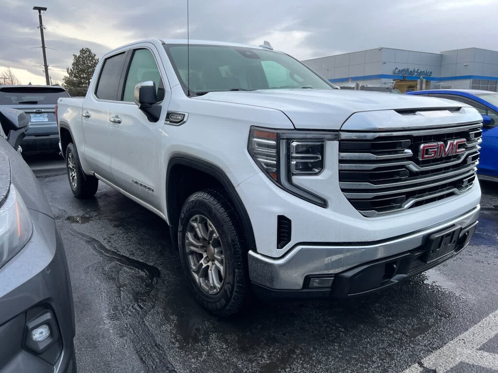 Summit White 2024 GMC Sierra 1500 SLT 4WD 10-Speed Automatic EcoTec3 5.3L V8 10-Speed Automatic, 4WD, Black Leather, 10-Way Power Driver Seat Adjuster w/Lumbar, 10-Way Power Passenger Seat Adjuster w/Lumbar, 120-Volt Interior Power Outlet, 170 Amp Alternator, 2 Charge/Data USB Ports, 2 Type-C Charge-Only Rear USB Ports, 6-Speaker Audio System Feature, Auto-Locking Rear Differential, Auxiliary External Transmission Oil Cooler, Chrome Header & Chrome Grille Insert Bars, Color-Keyed Carpeting Floor Covering, Deep-Tinted Glass, Electric Rear-Window Defogger, Front Frame-Mounted Black Recovery Hooks, Front Rain-Sensing Wipers, GMC Connected Access Capable, HD Rear Vision Camera, Heated front seats, Heated steering wheel, Hitch Guidance, Keyless Open & Start, LED Cargo Area Lighting, Manual Tilt-Wheel & Telescoping Steering Column, Navigation System, OnStar & GMC Connected Services Capable, Perimeter Lighting, Power Door Locks, Power Front Passenger Windows w/Express Up/Down, Power Front Windows w/Driver Express Up/Down, Power Rear Windows w/Express Down, Preferred Equipment Group 4SA, Push Button Start, Rear Wheelhouse Liners, Remote Vehicle Starter System, SiriusXM w/360L, Steering Wheel Audio Controls, Theft Deterrent System (Unauthorized Entry), Trailering Package, Wi-Fi Hotspot Capable. One owner local vehicle.