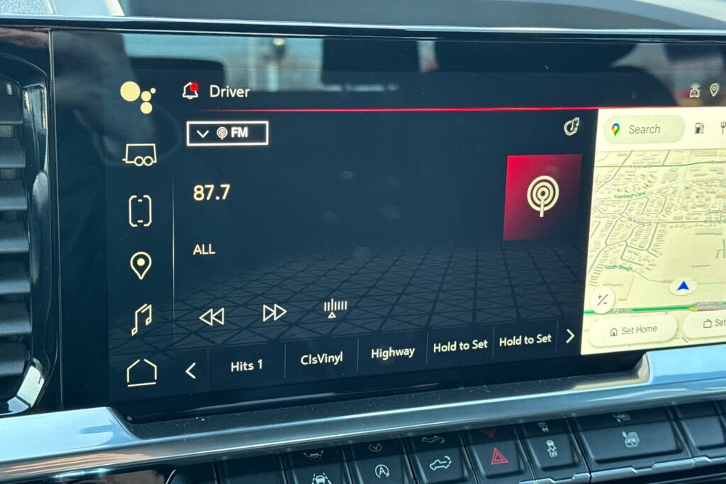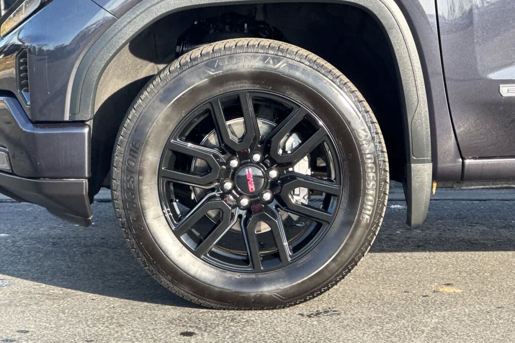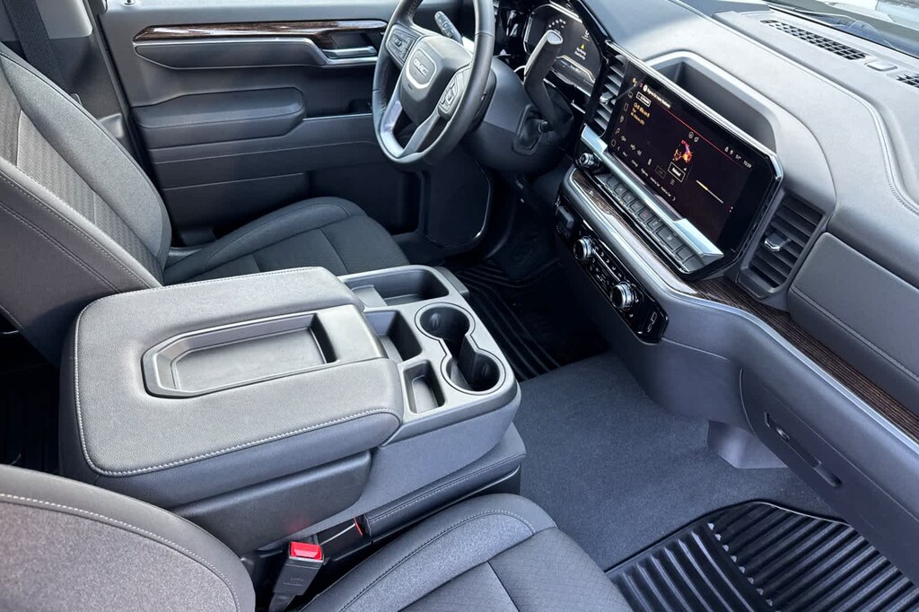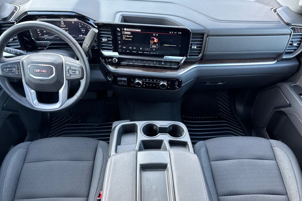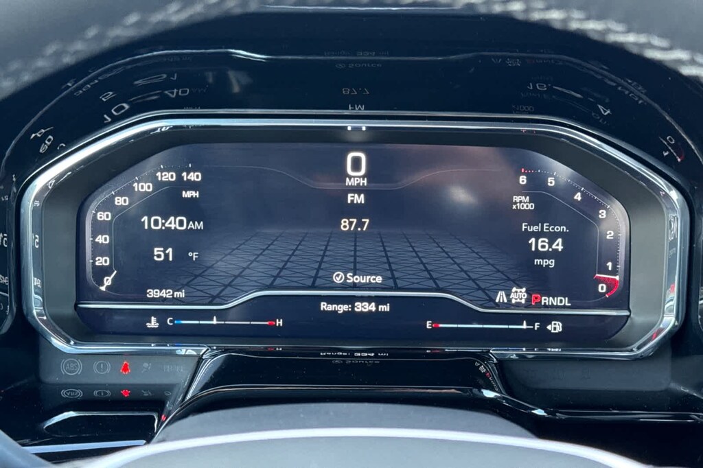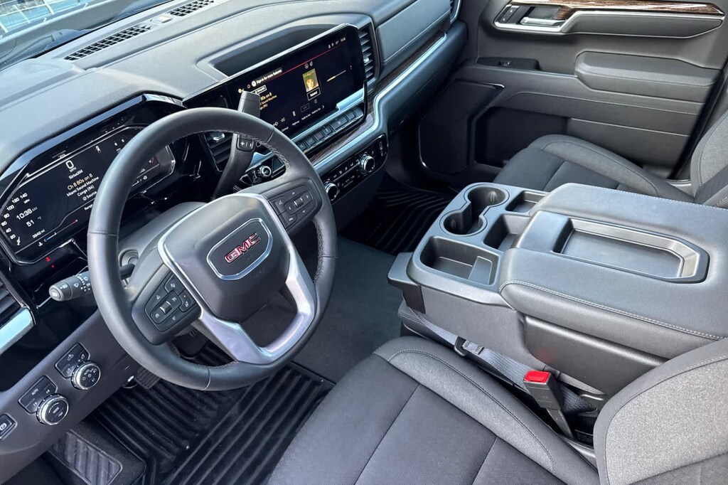 BEDLINER, SPRAY-ON Pickup bedliner with GMC logo, AUDIO SYSTEM, 13.4 DIAGONAL PREMIUM GMC INFOTAINMENT SYSTEM WITH GOOGLE BUILT IN APPS SUCH AS NAVIGATION AND VOICE ASSISTANCE, INCLUDES COLOR TOUCH-SCREEN, MULTI-TOUCH DISPLAY, AM/FM STEREO Bluetooth® streaming audio for music and most phones; featuring wireless Android Auto® and Apple CarPlay® capability for compatible phones (STD), ENGINE, TURBOMAX (310 hp [231 kW] @ 5600 rpm, 430 lb-ft of torque [583 Nm] @ 3000 rpm) (Includes (KW5) 220-amp alternator and (MFC) 8-speed automatic transmission. (STD). 2025 GMC Sierra 1500 with Titanium Rush Metallic exterior and Jet Black interior features a 4 Cylinder Engine with 310 HP at 5600 RPM*.