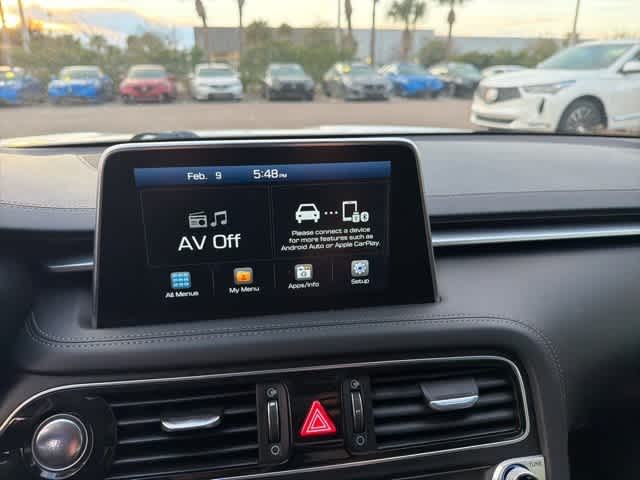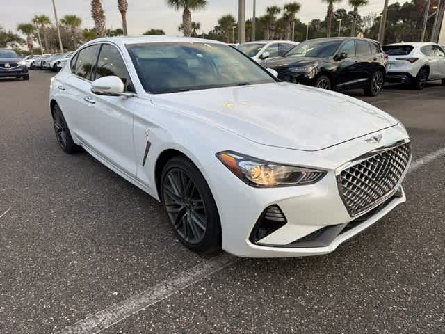 This 2019 Genesis G70 2.0T Advanced in White, features 4-Wheel Disc Brakes, 6 Speakers, ABS brakes, Air Conditioning, Alloy wheels, AM/FM radio: SiriusXM, Android Auto & Apple CarPlay, Anti-whiplash front head restraints, Auto High-beam Headlights, Auto-dimming Rear-View mirror, Automatic temperature control, Brake assist, Bumpers: body-color, Delay-off headlights, Driver door bin, Driver vanity mirror, Dual front impact airbags, Dual front side impact airbags, Electronic Stability Control, Emergency communication system: Genesis Connected Services, Exterior Parking Camera Rear, Four wheel independent suspension, Front anti-roll bar, Front Bucket Seats, Front Center Armrest, Front dual zone A/C, Front reading lights, Fully automatic headlights, Garage door transmitter: HomeLink, Heated door mirrors, Illuminated entry, Knee airbag, Leatherette Seat Trim, Low tire pressure warning, Multi-Adjustable Front Bucket Seats, Occupant sensing airbag, Outside temperature display, Overhead airbag, Overhead console, Panic alarm, Passenger door bin, Passenger vanity mirror, Power door mirrors, Power driver seat, Power passenger seat, Power steering, Power windows, Radio: AM/FM/HD Radio/SiriusXM Audio System, Rear anti-roll bar, Rear reading lights, Rear seat center armrest, Rear window defroster, Remote keyless entry, Security system, Speed control, Speed-Sensitive Wipers, Split folding rear seat, Steering wheel mounted audio controls, Tachometer, Telescoping steering wheel, Tilt steering wheel, Traction control, Trip computer, Turn signal indicator mirrors, Variably intermittent wipers, and Wheels: 18 x 8.0J Alloy: