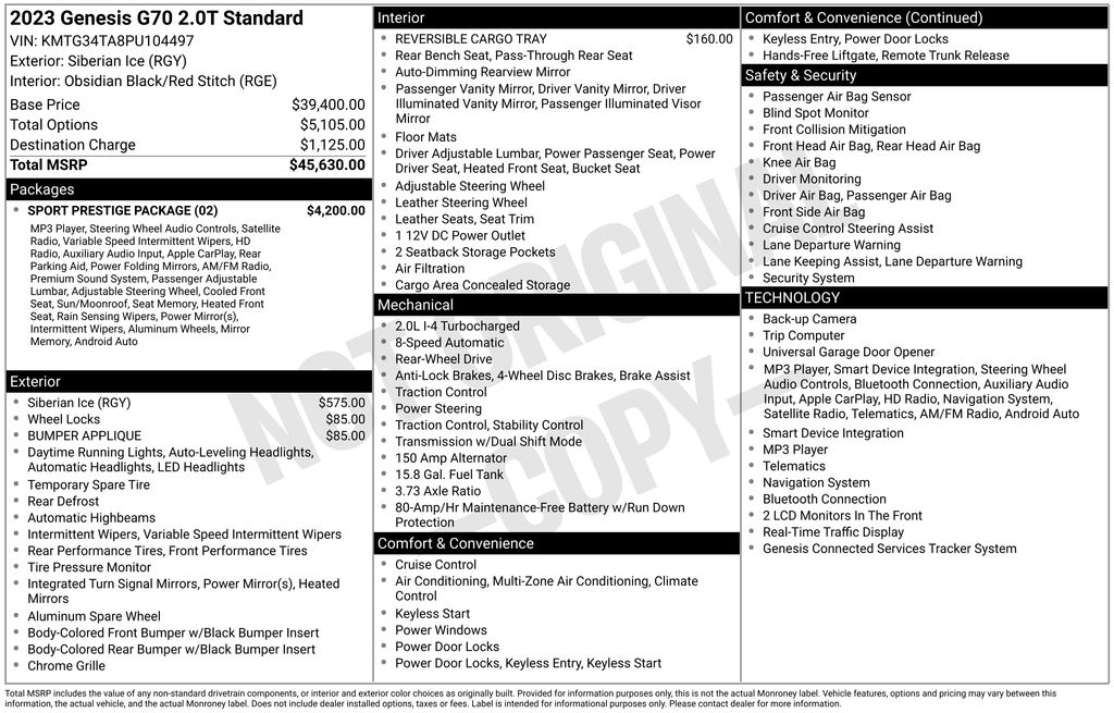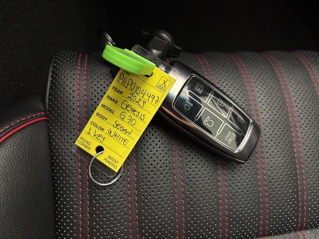 Siberian Ice 2023 Genesis G70 4D Sedan 2.0T RWD I4 G70 2.0T, 4D Sedan, I4, 8-Speed Automatic with SHIFTRONIC, RWD, Siberian Ice, Obsidian Black/Red Stitch Leather, 4-Way Power Lumbar Front Passenger Seat, 4-Wheel Disc Brakes, 6 Speakers, ABS brakes, Acoustic Front Door Glass, Air Conditioning, Alloy Pedals, Alloy wheels, AM/FM radio: SiriusXM, Android Auto & Apple CarPlay, Anti-whiplash front head restraints, Auto High-beam Headlights, Auto-dimming Rear-View mirror, Automatic temperature control, Brake assist, Bumper Applique, Bumpers: body-color, Dark Chrome Grille & Daylight Opening Trim, Delay-off headlights, Driver door bin, Driver vanity mirror, Dual front impact airbags, Dual front side impact airbags, Electronic Stability Control, Emergency communication system: Genesis Connected Services, Exterior Parking Camera Rear, Forward & Reverse Parking Distance Warning, Four wheel independent suspension, Front anti-roll bar, Front Bucket Seats, Front Center Armrest, Front dual zone A/C, Front Passenger Seat Walk-In Device, Front reading lights, Fully automatic headlights, Garage door transmitter: HomeLink, Heated door mirrors, Heated front seats, Heated Multi-Adjustable Front Bucket Seats, Illuminated entry, Integrated Memory System (IMS), Knee airbag, Leather Seating Surfaces, Leatherette Seating Surfaces, Low tire pressure warning, Navigation System, Occupant sensing airbag, Option Group 02, Outside temperature display, Overhead airbag, Overhead console, Panic alarm, Passenger door bin, Passenger vanity mirror, Power door mirrors, Power driver seat, Power Folding ECM Outside Mirrors, Power passenger seat, Power steering, Power Telescoping Steering Wheel, Power windows, Radio: AM/FM/SiriusXM/HD Audio System, Radio: AM/FM/SiriusXM/HD Lexicon Prem Audio System, Rain-Sensing Wipers, Rear anti-roll bar, Rear reading lights, Rear seat center armrest, Rear window defroster, Remote keyless entry, Reversible Cargo Tray, Security system, Speed control, Speed-Sensitive Wipers, Split folding rear seat, Sport Aluminum Trim, Sport Prestige Package, Steering wheel mounted audio controls, Tachometer, Telescoping steering wheel, Traction control, Trip computer, Turn signal indicator mirrors, Variably intermittent wipers, Ventilated Front Seats, Wheels: 19" x 8.0J Fr & 19" x 8.5J Rr Alloy, Wheels: 19" x 8.0J Fr & 19" x 8.5J Rr Sport Alloy, Wide Sunroof, Wireless Device Charging.