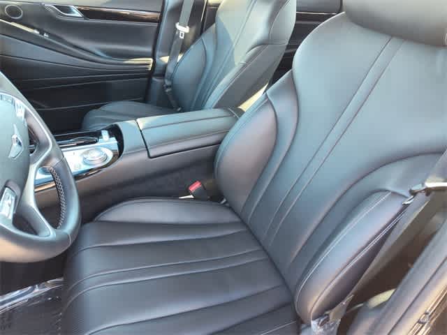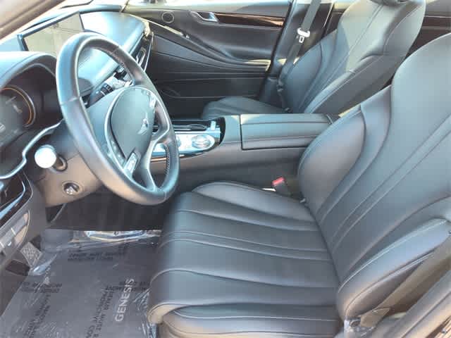 THIS VEHICLE ALSO IS EQUIPPED WITH THE FOLLOWING OPTIONS AND FEATURES: Option Group 01, 12 Speakers, 4-Wheel Disc Brakes, ABS brakes, Air Conditioning, Alloy wheels, AM/FM radio: SiriusXM, Android Auto & Apple CarPlay, Anti-whiplash front head restraints, Auto High-beam Headlights, Auto tilt-away steering wheel, Auto-dimming door mirrors, Auto-dimming Rear-View mirror, Automatic temperature control, Bumpers: body-color, Compass, Delay-off headlights, Driver door bin, Driver vanity mirror, Dual front impact airbags, Dual front side impact airbags, Electronic Stability Control, Emergency communication system: Genesis Connected Services, Exterior Parking Camera Rear, Four wheel independent suspension, Front anti-roll bar, Front Bucket Seats, Front Center Armrest, Front dual zone A/C, Front reading lights, Fully automatic headlights, Garage door transmitter: HomeLink, Heated door mirrors, Heated Front Bucket Seats, Heated front seats, Illuminated entry, Knee airbag, Leather steering wheel, Leatherette Seating Surfaces, Low tire pressure warning, Memory seat, Navigation System, Occupant sensing airbag, Outside temperature display, Overhead airbag, Overhead console, Panic alarm, Passenger door bin, Passenger vanity mirror, Power door mirrors, Power driver seat, Power passenger seat, Power steering, Power windows, Radio data system, Radio: AM/FM/HD/SiriusXM Audio System, Rain sensing wipers, Rear anti-roll bar, Rear reading lights, Rear seat center armrest, Rear side impact airbag, Rear window defroster, Remote keyless entry, Security system, Speed control, Speed-sensing steering, Speed-Sensitive Wipers, Steering wheel memory, Steering wheel mounted audio controls, Tachometer, Telescoping steering wheel, Tilt steering wheel, Traction control, Trip computer, Turn signal indicator mirrors, Variably intermittent wipers, and Wheels: 18x8.0J Alloy.