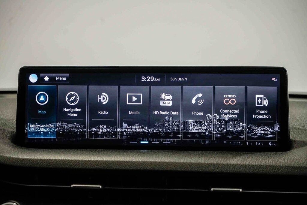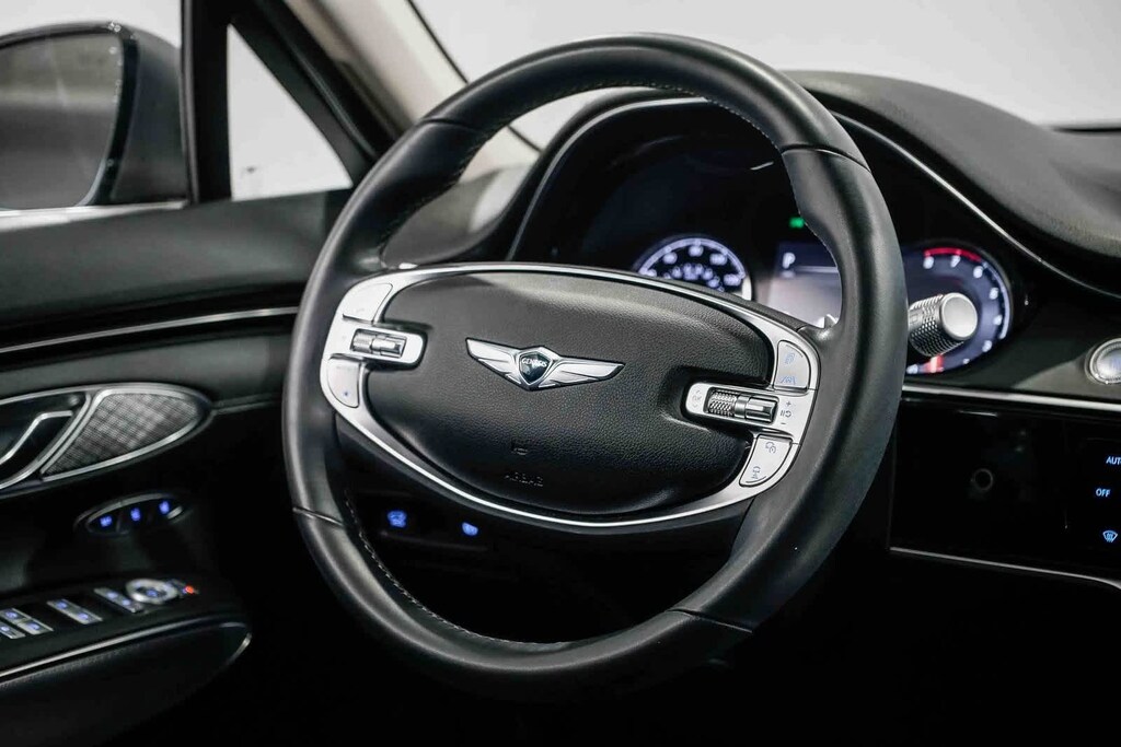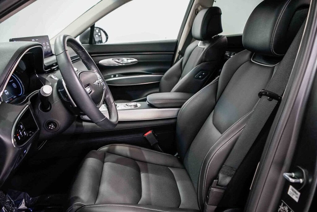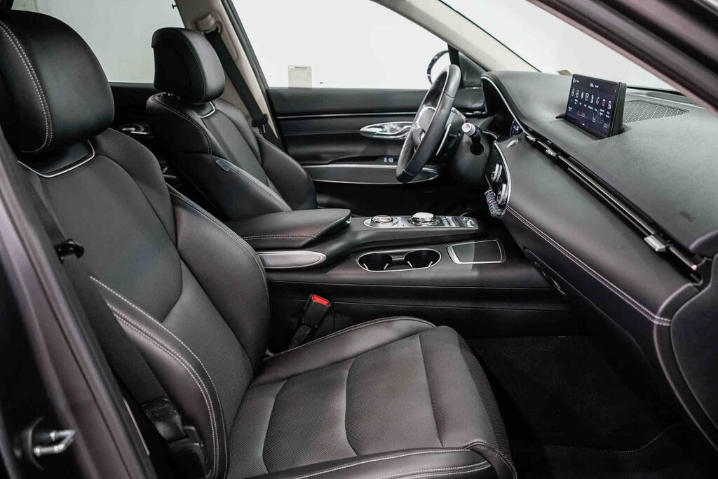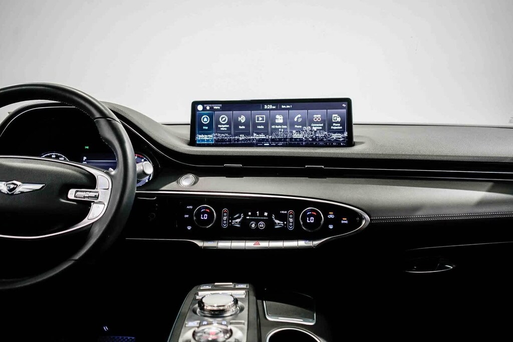 This vehicle includes: Select Package (Heated Steering Wheel, Integrated Memory System (IMS), Monobloc Front Brakes, Option Group 02, Power Folding ECM Mirrors w/Genesis Logo Lamp, Power Telescoping Steering Wheel, Power Tilt & Slide Panoramic Sunroof, and Ventilated Front Seats), ABS brakes, Alloy wheels, Electronic Stability Control, Emergency communication system, Front dual zone A/C, Heated door mirrors, Heated Front Bucket Seats, Heated front seats, Illuminated entry, Low tire pressure warning, Navigation System, Power Liftgate, Remote keyless entry, Traction control, 4-Wheel Disc Brakes, 4.181 Axle Ratio, 9 Speakers, Air Conditioning, AM/FM radio: SiriusXM, Android Auto & Apple CarPlay, Anti-whiplash front head restraints, Auto High-beam Headlights, Auto-dimming Rear-View mirror, Automatic temperature control, Brake assist, Bumpers: body-color, Delay-off headlights, Driver door bin, Driver vanity mirror, Dual front impact airbags, Dual front side impact airbags, Exterior Parking Camera Rear, Four wheel independent suspension, Front anti-roll bar, Front Bucket Seats, Front Center Armrest w/Storage, Front reading lights, Fully automatic headlights, Garage door transmitter: HomeLink, Knee airbag, Leatherette Seating Surfaces, Occupant sensing airbag, Outside temperature display, Overhead airbag, Overhead console, Panic alarm, Passenger door bin, Passenger vanity mirror, Power door mirrors, Power driver seat, Power passenger seat, Power steering, Power windows, Radio: AM/FM/SiriusXM/HD Premium Audio System, Rain sensing wipers, Rear anti-roll bar, Rear Parking Sensors, Rear reading lights, Rear seat center armrest, Rear window defroster, Rear window wiper, Security system, Speed control, Speed-sensing steering, Speed-Sensitive Wipers, Split folding rear seat, Spoiler, Steering wheel mounted audio controls, Tachometer, Telescoping steering wheel, Tilt steering wheel, Trip computer, Turn signal indicator mirrors, Variably intermittent wipers, and Wheels: 19 Dark Hyper Silver Aluminum