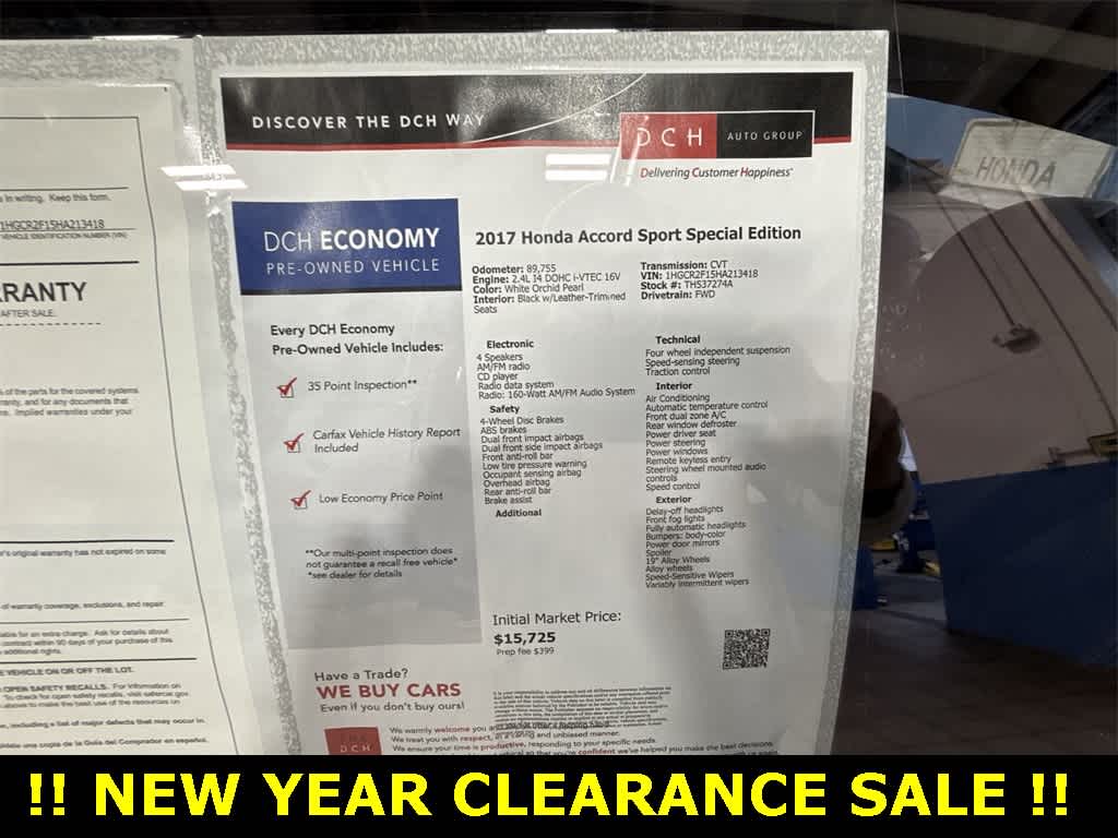 White 2017 Honda Accord Sport Special Edition FWD CVT 2.4L I4 DOHC i-VTEC 16V Black w/Leather-Trimmed Seats.