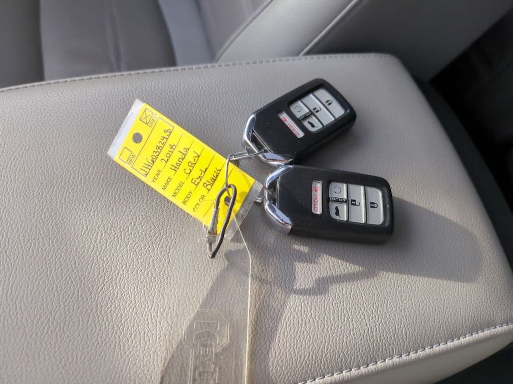 Clean CARFAX. Crystal Black Pearl 2018 Honda CR-V EX-L AWD CVT 1.5L I4 DOHC 16V AWD, 18 Alloy Wheels, 4-Wheel Disc Brakes, 5.64 Axle Ratio, 8 Speakers, ABS brakes, Air Conditioning, Alloy wheels, AM/FM radio: SiriusXM, Apple CarPlay/Android Auto, Auto High-beam Headlights, Auto-dimming Rear-View mirror, Automatic temperature control, Blind Spot Information (BSI) System warning, Brake assist, Bumpers: body-color, Compass, Delay-off headlights, Driver door bin, Driver vanity mirror, Dual front impact airbags, Dual front side impact airbags, Electronic Stability Control, Exterior Parking Camera Rear, Four wheel independent suspension, Front anti-roll bar, Front Bucket Seats, Front Center Armrest, Front dual zone A/C, Front fog lights, Front reading lights, Fully automatic headlights, Garage door transmitter: HomeLink, Heated door mirrors, Heated Front Bucket Seats, Heated front seats, Illuminated entry, Leather Seat Trim, Leather Shift Knob, Low tire pressure warning, Memory seat, Occupant sensing airbag, Outside temperature display, Overhead airbag, Overhead console, Panic alarm, Passenger door bin, Passenger vanity mirror, Power door mirrors, Power driver seat, Power Liftgate, Power moonroof, Power passenger seat, Power steering, Power windows