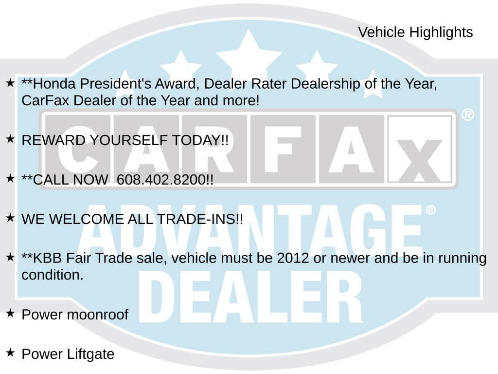 **Honda Presidents Award, Dealer Rater Dealership of the Year, CarFax Dealer of the Year and more!, REWARD YOURSELF TODAY!!, **CALL NOW 608.402.8200!!, WE WELCOME ALL TRADE-INS!!, **KBB Fair Trade sale, vehicle must be 2012 or newer and be in running condition., Besides many of the features just listed, this Honda CR-V also may have many of the following;, AWD, Power Liftgate, Power moonroof, 18 Alloy Wheels, 4-Wheel Disc Brakes, 5.64 Axle Ratio, 8 Speakers, ABS brakes, Air Conditioning, Alloy wheels, AM/FM radio: SiriusXM, Apple CarPlay/Android Auto, Auto High-beam Headlights, Auto-dimming Rear-View mirror, Automatic temperature control, Blind Spot Information (BSI) System warning, Brake assist, Bumpers: body-color, Compass, Delay-off headlights, Driver door bin, Driver vanity mirror, Dual front impact airbags, Dual front side impact airbags, Electronic Stability Control, Exterior Parking Camera Rear, Four wheel independent suspension, Front anti-roll bar, Front Bucket Seats, Front Center Armrest, Front dual zone A/C, Front fog lights, Front reading lights, Fully automatic headlights, Garage door transmitter: HomeLink, Heated door mirrors, Heated Front Bucket Seats, Heated front seats, Illuminated entry, Leather Seat Trim, Leather Shift Knob, Low tire pressure warning, Memory seat, Occupant sensing airbag, Outside temperature display, Overhead airbag, Overhead console, Panic alarm, Passenger door bin, Passenger vanity mirror, Power door mirrors, Power driver seat, Power passenger seat, Power steering, Power windows, Radio data system, Radio: AM/FM/SiriusXM Audio System, Rear anti-roll bar, Rear seat center armrest, Rear window defroster, Rear window wiper, Remote keyless entry, Security system, Speed control, Speed-sensing steering, Speed-Sensitive Wipers, Split folding rear seat, Spoiler, Steering wheel mounted audio controls, Tachometer, Telescoping steering wheel, Tilt steering wheel, Traction control, Trip computer, Turn signal indicator mirrors, Variably intermittent wipers, AWD, Power Liftgate, Power moonroof.