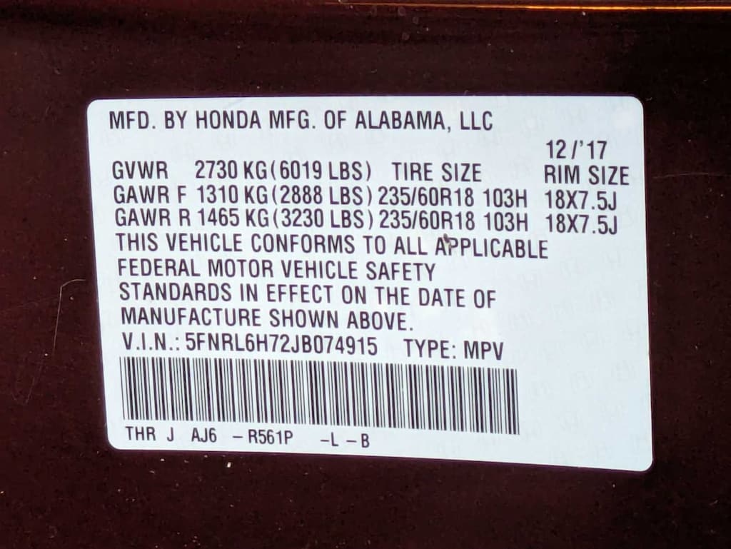 3rd row seats: split-bench, 4-Wheel Disc Brakes, 4.33 Axle Ratio, 7 Speakers, ABS brakes, Air Conditioning, Alloy wheels, AM/FM radio: SiriusXM, Anti-whiplash front head restraints, Apple CarPlay/Android Auto, Auto High-beam Headlights, Auto-dimming Rear-View mirror, Automatic temperature control, Blind Spot Information (BSI) System warning, Brake assist, Bumpers: body-color, Delay-off headlights, Driver door bin, Driver vanity mirror, Drivers Seat Mounted Armrest, Dual front impact airbags, Dual front side impact airbags, Electronic Stability Control, Emergency communication system: HondaLink, Exterior Parking Camera Rear, Four wheel independent suspension, Front anti-roll bar, Front Bucket Seats, Front dual zone A/C, Front fog lights, Front reading lights, Fully automatic headlights, Garage door transmitter: HomeLink, Heated door mirrors, Heated Front Bucket Seats, Heated front seats, Illuminated entry, Knee airbag, Leather Seat Trim, Leather steering wheel, Low tire pressure warning, Memory seat, Occupant sensing airbag, Outside temperature display, Overhead airbag, Overhead console, Panic alarm, Passenger door bin, Passenger seat mounted armrest, Passenger vanity mirror, Power door mirrors, Power driver seat, Power Liftgate, Power moonroof, Power passenger seat, Power steering, Power windows, Radio data system, Radio: 160-Watt AM/FM/HD/SiriusXM Audio System, Rear air conditioning, Rear anti-roll bar, Rear reading lights, Rear seat center armrest, Rear window defroster, Rear window wiper, Reclining 3rd row seat, Remote keyless entry, Security system, Speed control, Speed-sensing steering, Speed-Sensitive Wipers, Split folding rear seat, Spoiler, Steering wheel mounted audio controls, Tachometer, Telescoping steering wheel, Tilt steering wheel, Traction control, Trip computer, Turn signal indicator mirrors, Variably intermittent wipers, and Wheels: 18 Silver-Painted Alloy.
