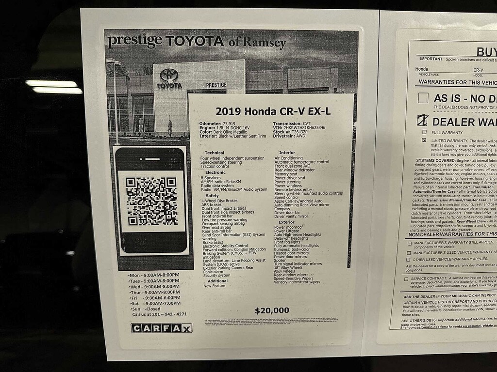 This 2019 Honda CR-V EX-L will not make it to the weekend!! CALL NOW to reserve your test drive!! (844) 838-7075 Please Visit www.PrestigeToyota.com for further details. Price does not include licensing costs, registration fees, taxes and dealer doc fee of $999 which are to be paid by the consumer.