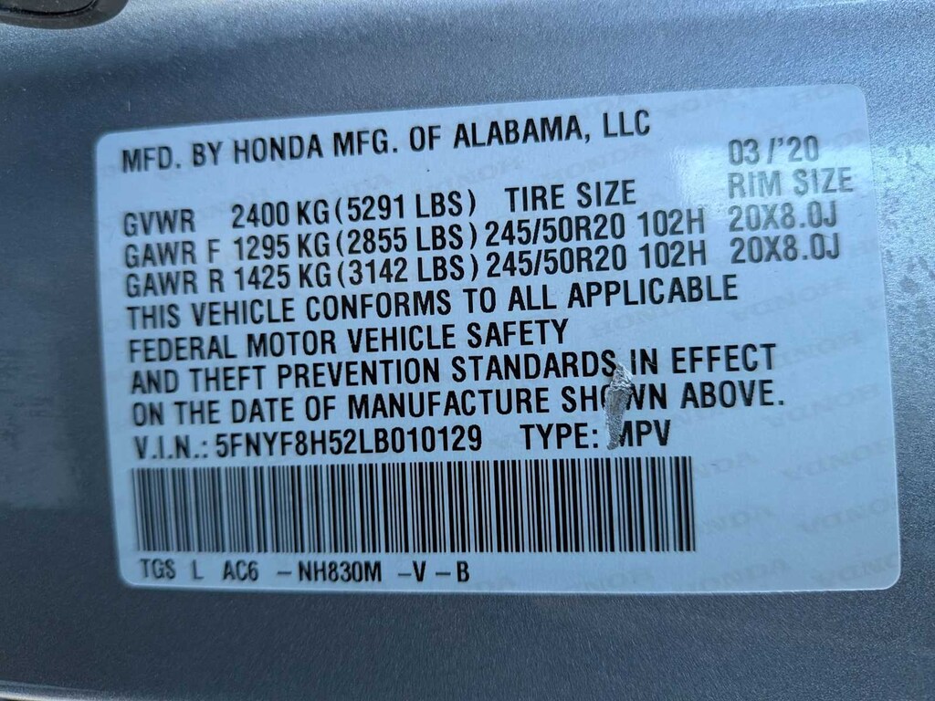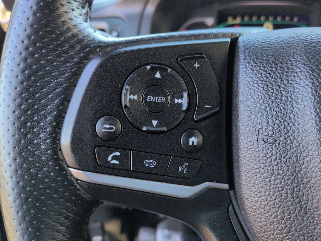 A/V remote: CabinControl, Apple CarPlay/Android Auto, Blind Spot Information (BSI) System warning, Exterior Parking Camera Rear, Forward collision: Collision Mitigation Braking System (CMBS) + FCW mitigation, Front Bucket Seats, Front fog lights, Fully automatic headlights, Heated Front Bucket Seats, Lane departure: Lane Keeping Assist System (LKAS) active, Leather-Trimmed Seats, Memory seat, Power driver seat, Power Liftgate, Power moonroof, Power passenger seat, Radio: 215-Watt Audio System w/7 Speakers, Spoiler, Steering wheel mounted audio controls, Wheels: 20 Split-Spoke Pewter Gray Alloy, 4-Wheel Disc Brakes, 4.334 Axle Ratio, 7 Speakers, ABS brakes, Air Conditioning, Alloy wheels, AM/FM radio: SiriusXM, Auto High-beam Headlights, Auto-dimming Rear-View mirror, Automatic temperature control, Brake assist, Bumpers: body-color, Delay-off headlights, Driver door bin, Driver vanity mirror, Drivers Seat Mounted Armrest, Dual front impact airbags, Dual front side impact airbags, Electronic Stability Control, Emergency communication system: HondaLink Assist, Four wheel independent suspension, Front anti-roll bar, Front Center Armrest, Front dual zone A/C, Front reading lights, Garage door transmitter: HomeLink, Heated door mirrors, Heated front seats, Illuminated entry, Low tire pressure warning, Occupant sensing airbag, Outside temperature display, Overhead airbag, Overhead console, Panic alarm, Passenger door bin, Passenger seat mounted armrest, Passenger vanity mirror, Power door mirrors, Power steering, Power windows, Radio data system, Rear air conditioning, Rear anti-roll bar, Rear reading lights, Rear seat center armrest, Rear window defroster, Rear window wiper, Remote keyless entry, Security system, Speed control, Speed-sensing steering, Split folding rear seat, Tachometer, Telescoping steering wheel, Tilt steering wheel, Traction control, Trip computer, Turn signal indicator mirrors, and Variably intermittent wipers.