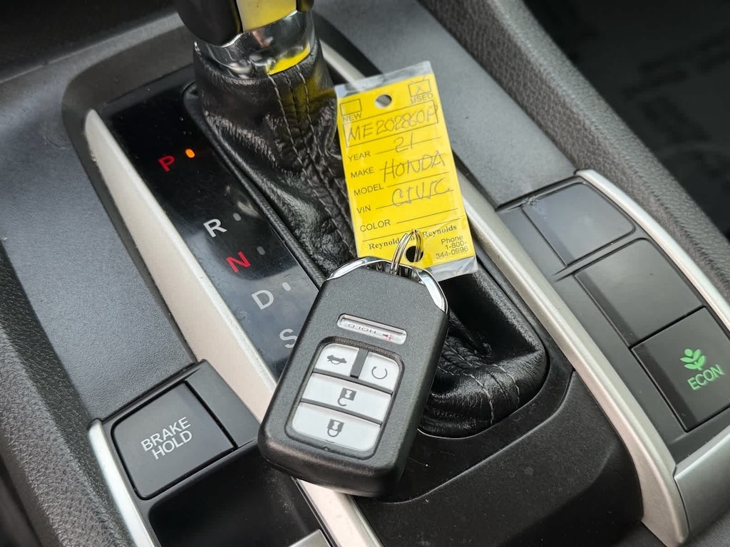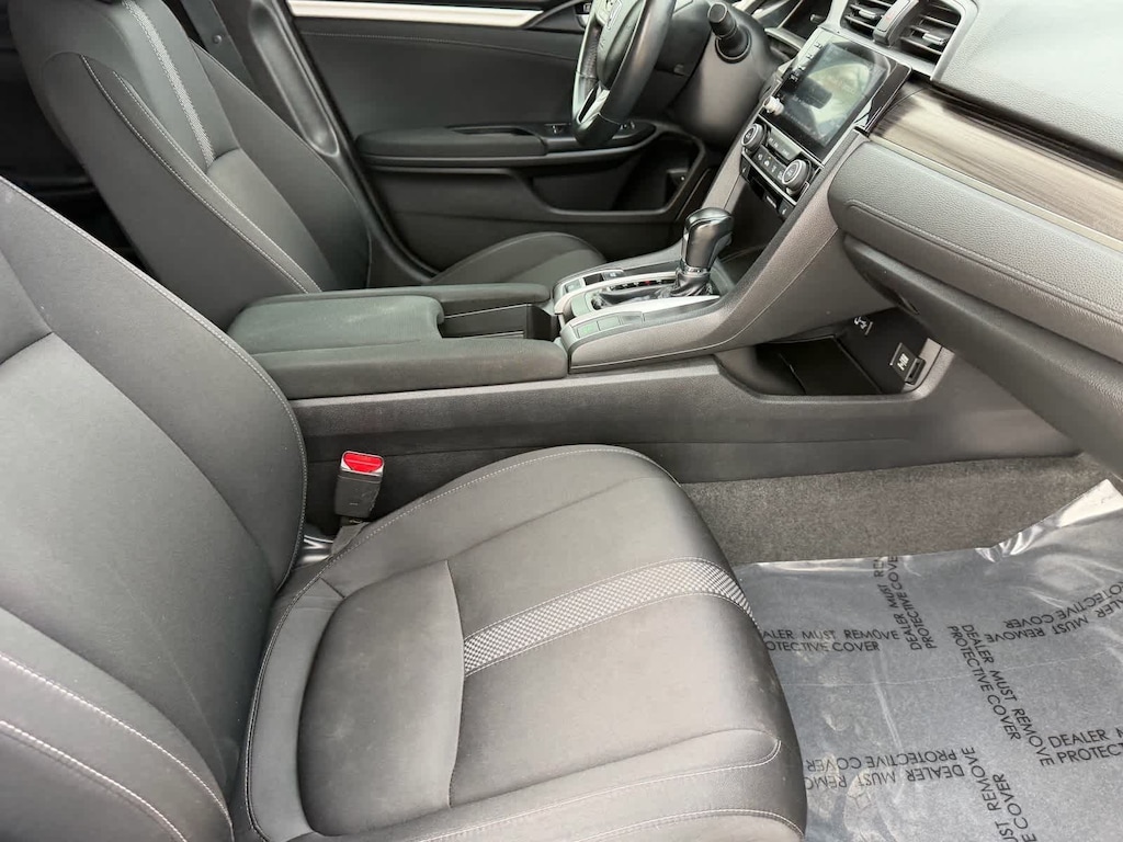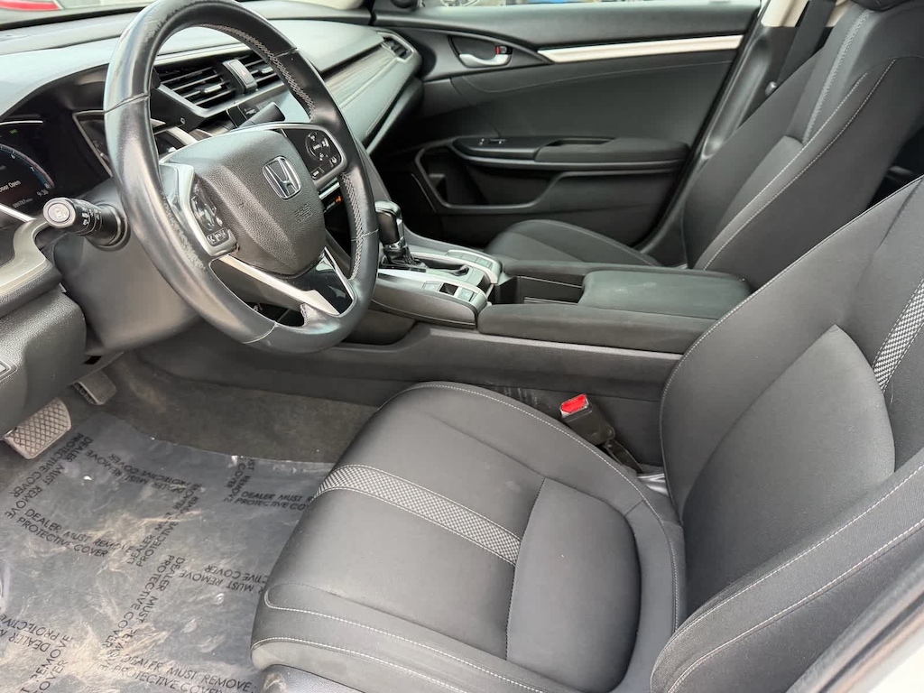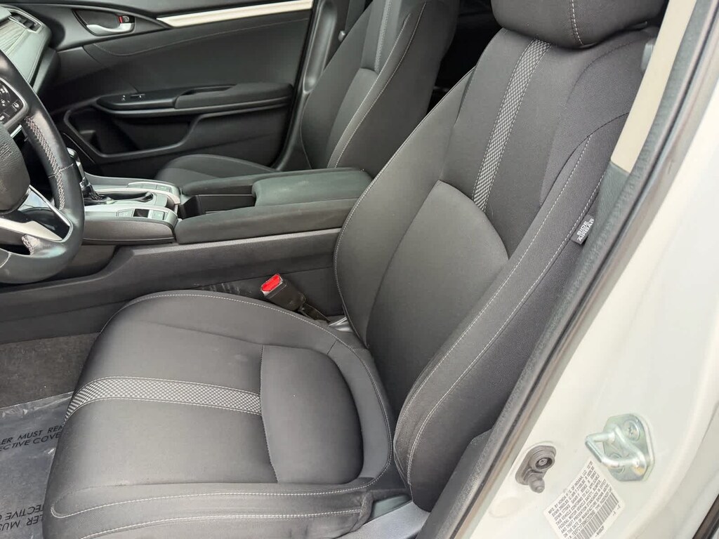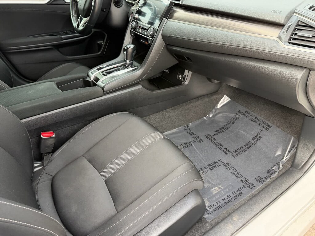 Gray Cloth, 17 Alloy Wheels, 4-Wheel Disc Brakes, 8 Speakers, ABS brakes, Adaptive Cruise Control: Adaptive Cruise Control (ACC) with Low-Speed Follow, Air Conditioning, Alloy wheels, AM/FM radio: SiriusXM, Apple CarPlay/Android Auto, Auto High-beam Headlights, Automatic temperature control, Brake assist, Bumpers: body-color, Cloth Seat Trim, Delay-off headlights, Driver door bin, Driver vanity mirror, Dual front impact airbags, Dual front side impact airbags, Electronic Stability Control, Emergency communication system: HondaLink, Exterior Parking Camera Rear, Forward collision: Collision Mitigation Braking System (CMBS) + FCW mitigation, Four wheel independent suspension, Front anti-roll bar, Front Bucket Seats, Front Center Armrest, Front dual zone A/C, Front fog lights, Front reading lights, Fully automatic headlights, Heated door mirrors, Heated Front Bucket Seats, Heated front seats, Illuminated entry, Lane departure: Lane Keeping Assist System (LKAS) active, Leather Shift Knob, Low tire pressure warning, Occupant sensing airbag, Outside temperature display, Overhead airbag, Overhead console, Panic alarm, Passenger door bin, Passenger vanity mirror, Power door mirrors, Power driver seat, Power moonroof, Power steering, Power windows, Radio data system, Radio: 180-Watt AM/FM/HD/SiriusXM Audio System, Rear anti-roll bar, Rear seat center armrest, Rear window defroster, Remote keyless entry, Security system, Speed control, Speed-sensing steering, Speed-Sensitive Wipers, Split folding rear seat, Spoiler, Steering wheel mounted audio controls, Tachometer, Telescoping steering wheel, Tilt steering wheel, Traction control, Trip computer, and Variably intermittent wipers. White 2021 Honda Civic EX FWD CVT 1.5L I-4 DI DOHC Turbocharged Gray Cloth.