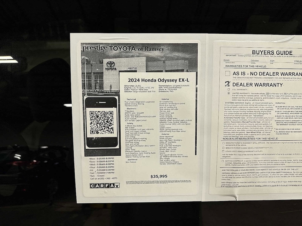This 2024 Honda Odyssey EX-L will not make it to the weekend!! CALL NOW to reserve your test drive!! (844) 838-7075 Please Visit www.PrestigeToyota.com for further details. Price does not include licensing costs, registration fees, taxes and dealer doc fee of $999 which are to be paid by the consumer.