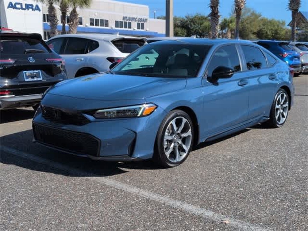This 2025 Honda Civic Hybrid Sport in Blue, features 4-Wheel Disc Brakes, 8 Speakers, ABS brakes, Adaptive Cruise Control: Adaptive Cruise Control (ACC) with Low-Speed Follow, Air Conditioning, Alloy wheels, AM/FM radio, Apple CarPlay/Android Auto, Auto High-beam Headlights, Automatic temperature control, Blind Spot Information (BSI) System warning, Brake assist, Bumpers: body-color, Cloth/Leatherette Seat Trim, Delay-off headlights, Driver door bin, Driver vanity mirror, Dual front impact airbags, Dual front side impact airbags, Electronic Stability Control, Emergency communication system: HondaLink, Exterior Parking Camera Rear, Four wheel independent suspension, Front anti-roll bar, Front Bucket Seats, Front Center Armrest, Front dual zone A/C, Front reading lights, Fully automatic headlights, Heated door mirrors, Heated Front Bucket Seats, Heated front seats, Illuminated entry, Knee airbag, Leather Shift Knob, Leather steering wheel, Low tire pressure warning, Occupant sensing airbag, Outside temperature display, Overhead airbag, Panic alarm, Passenger door bin, Passenger vanity mirror, Power door mirrors, Power moonroof, Power steering, Power windows, Radio data system, Radio: 180-Watt Audio System, Rear anti-roll bar, Rear seat center armrest, Rear side impact airbag, Rear window defroster, Remote keyless entry, Security system, Speed control, Speed-sensing steering, Split folding rear seat, Steering wheel mounted audio controls, Tachometer, Telescoping steering wheel, Tilt steering wheel, Traction control, Trip computer, Variably intermittent wipers, and Wheels: 18 Gloss Black Alloy: