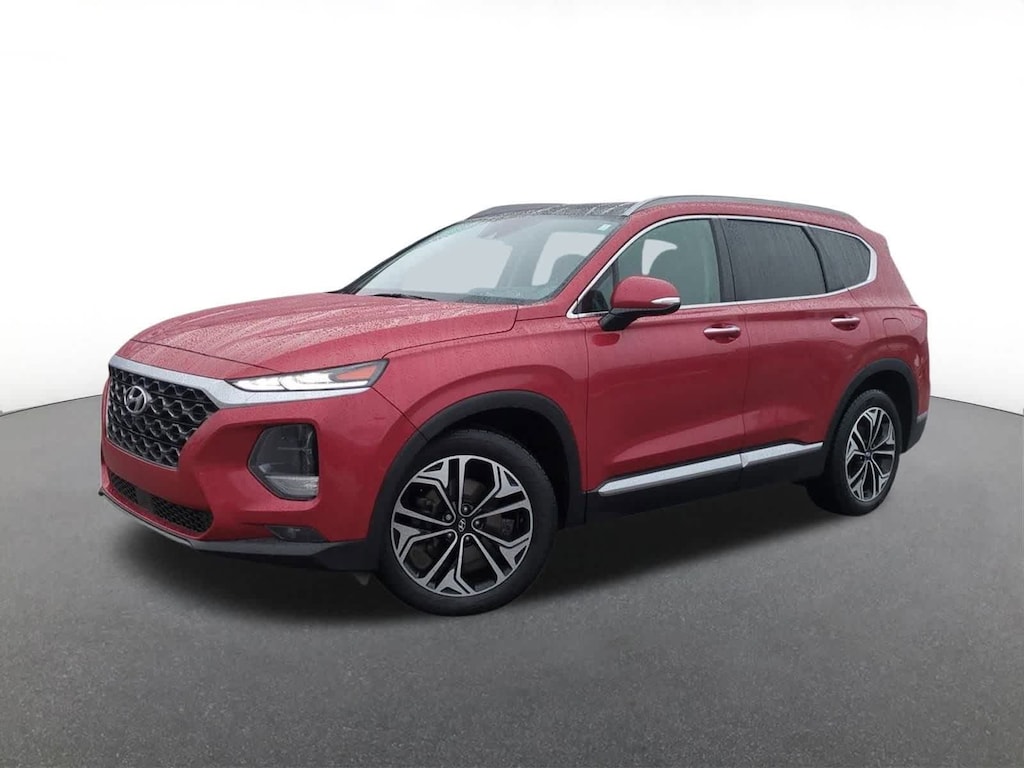 Scarlet Red 2019 Hyundai Santa Fe Ultimate AWD 8-Speed Automatic with SHIFTRONIC 2.0L Turbocharged AWD, Black/Black w/Leather Seating Surface.