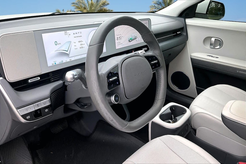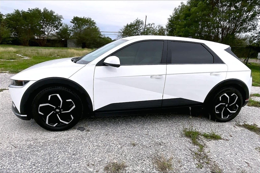 FRESH OIL CHANGE, 4-Wheel Disc Brakes, 4.706 Axle Ratio, 6 Speakers, ABS brakes, Air Conditioning, Alloy wheels, AM/FM radio: SiriusXM, Apple CarPlay & Android Auto, Auto High-beam Headlights, Auto-dimming Rear-View mirror, Automatic temperature control, Bodyside moldings, Brake assist, Bumpers: body-color, Cargo Net, Cargo Package, Carpeted Floor Mats, Delay-off headlights, Driver door bin, Driver vanity mirror, Dual front impact airbags, Dual front side impact airbags, Electronic Stability Control, Emergency communication system: Blue Link Connected Car Service (3-year complimentary subscription), First Aid Kit, Four wheel independent suspension, Front anti-roll bar, Front Bucket Seats, Front Center Armrest w/Storage, Front dual zone A/C, Front reading lights, Fully automatic headlights, Garage door transmitter: HomeLink, H-Tex Leatherette Seating Surfaces, harman/kardonî Speakers, Heated door mirrors, Heated Front Bucket Seats, Heated front seats, Heated steering wheel, Illuminated entry, Leather steering wheel, Low tire pressure warning, Navigation System, Occupant sensing airbag, Option Group 01, Outside temperature display, Overhead airbag, Overhead console, Panic alarm, Passenger door bin, Passenger vanity mirror, Power door mirrors, Power driver seat, Power Liftgate, Power steering, Power windows, Radio: AM/FM/SiriusXM/HD Display Audio System, Rear anti-roll bar, Rear reading lights, Rear seat center armrest, Rear window defroster, Remote keyless entry, Security system, Speed control, Speed-sensing steering, Split folding rear seat, Spoiler, Steering wheel mounted audio controls, Telescoping steering wheel, Tilt steering wheel, Traction control, Trip computer, Turn signal indicator mirrors, Up Seatback Cargo Mat, Variably intermittent wipers, Wheel Locks, Wheels: 19 x 7.5J Aero Alloy. 132/98 City/Highway MPG Atlas White 2023 Hyundai IONIQ 5 SEL RWD 1-Speed Automatic Electric Motor