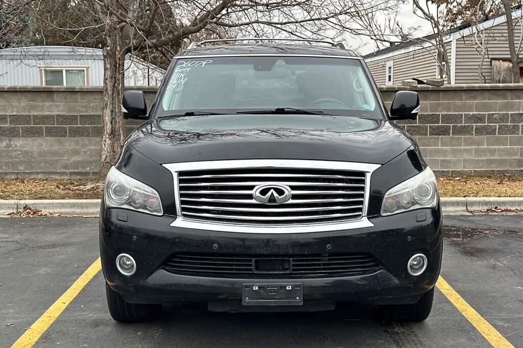 DELUXE TOURING PACKAGE 2nd-row footwell courtesy lights, Bose Cabin Surround Sound System, digital 5.1-decoding and 15 speakers, Hydraulic Body Motion Control System, Climate-Controlled Front Seats, Headlight Washers, Mocha Burl Trim, Advanced Climate Control System (ACCS), auto recirculation, Plasmacluster air purifier and Grape polyphenol filter, TECHNOLOGY PACKAGE Blind Spot Warning (BSW), Blind Spot Intervention (BSI), Intelligent Brake Assist (IBA), Forward Collision Warning (FCW), Adaptive Front Lighting System (AFS), auto-leveling headlights, Backup Collision Intervention, Intelligent Cruise Control (Full-Speed Range), Distance Control Assist (DCA), Front Pre-Crash Seatbelts, Lane Departure Warning (LDW), Lane Departure Prevention (LDP), THEATER PACKAGE wireless remote control, auxiliary audio/video input jacks and remote tip-up 2nd-row seats for easy 3rd-row entry/exit, 120V Power Outlet, Heated 2nd-Row Seats, Outboard only, Wireless Headphones (2), Dual 7 Color Monitors, Utilizes DVD player in front head unit, 22 WHEEL PACKAGE Wheels: 22 x 8.0 9-Spoke Forged Aluminum Alloy, Tires: P275/50RH22 AS Performance, ROOF RAIL CROSSBARS. 2014 INFINITI QX80 with Black Obsidian exterior and Graphite interior features a 8 Cylinder Engine with 400 HP at 5800 RPM*.