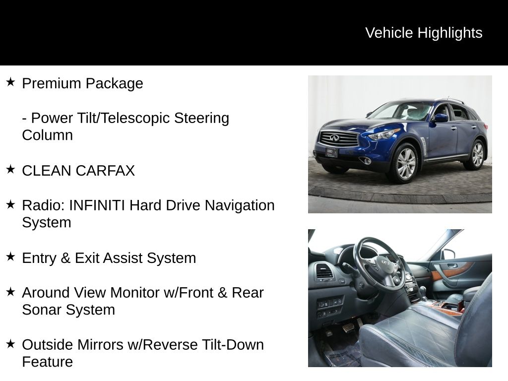 Under the hood, this QX70 is powered by a robust 3.7L V6 DOHC 24V engine mated to a smooth-shifting 7-Speed Automatic transmission with All-Wheel Drive. This powertrain delivers an exceptional blend of power and efficiency, with an EPA-estimated 16 city/22 highway MPG.