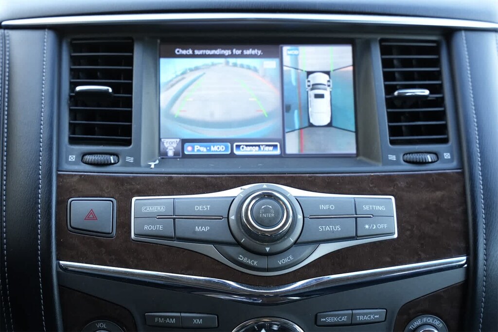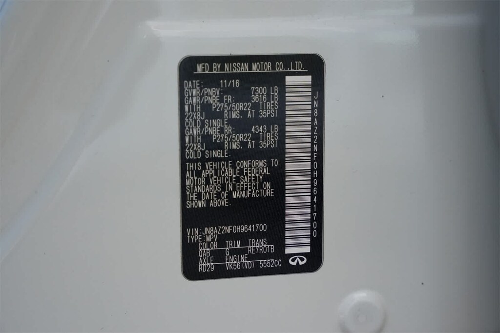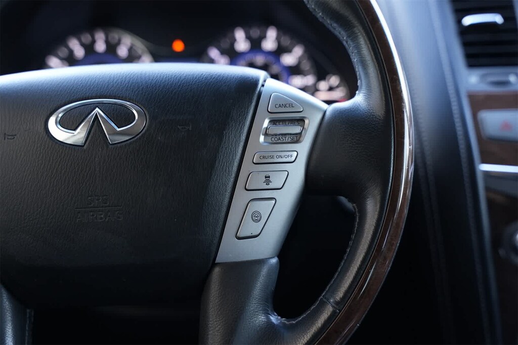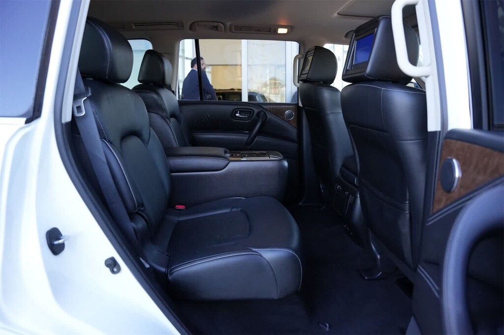 120V Power Outlet, 13 Speakers, 2.94 Axle Ratio, 22 Tire & Wheel Package, 3rd row seats: split-bench, 4-Wheel Disc Brakes, ABS brakes, Activation Disclaimer, Air Conditioning, Alloy wheels, AM/FM radio: SiriusXM, Anti-whiplash front head restraints, Auto High-beam Headlights, Auto tilt-away steering wheel, Auto-dimming door mirrors, Auto-dimming Rear-View mirror, Auto-leveling suspension, Automatic temperature control, Backup Collision Intervention (BCI), Blind Spot Intervention (BSI), Blind Spot Warning, Bose Premium Sound System, Brake assist, Bumpers: body-color, Carpeted Cargo Mat/Cargo Net & First Aid Kit, CD player, Delay-off headlights, Driver Assistance Package, Driver door bin, Driver vanity mirror, Dual 7 Color Monitors, Dual front impact airbags, Dual front side impact airbags, Electronic Stability Control, Emergency communication system: INFINITI Connection, Four wheel independent suspension, Front anti-roll bar, Front Bucket Seats, Front Center Armrest, Front dual zone A/C, Front fog lights, Front reading lights, Fully automatic headlights, Garage door transmitter: HomeLink, Genuine wood console insert, Genuine wood dashboard insert, Genuine wood door panel insert, Heated 2nd-Row Seats, Heated door mirrors, Heated Front Bucket Seats, Heated front seats, Heated steering wheel, Illuminated entry, Intelligent Cruise Control (Full-Speed Range), Lane Departure Warning System, Leather Shift Knob, Leather steering wheel, Leather-Appointed Seats w/Mocha Burl Trim, Literature Kit, Low tire pressure warning, Memory seat, Navigation System, Occupant sensing airbag, Outside temperature display, Overhead airbag, Overhead console, Panic alarm, Passenger door bin, Passenger vanity mirror, Power door mirrors, Power driver seat, Power Liftgate, Power moonroof, Power passenger seat, Power steering, Power windows, Radio data system, Rain sensing wipers, Rear air conditioning, Rear anti-roll bar, Rear audio controls, Rear reading lights, Rear seat center armrest, Rear window defroster, Rear window wiper, Reclining 3rd row seat, Remote keyless entry, Roof rack: rails only, Roof Rail Crossbars, Security system, Special Paint - Majestic White, Speed control, Speed-sensing steering, Split folding rear seat, Spoiler, Steering wheel memory, Steering wheel mounted audio controls, Tachometer, Telescoping steering wheel, Theater Package, Tilt steering wheel, Traction control, Trip computer, Turn signal indicator mirrors, Variably intermittent wipers, Voltmeter, Wheels: 20 x 8.0 Split 6-Spoke Aluminum-Alloy, Wheels: 22 x 8.0 14-Spoke Forged Aluminum-Alloy, Wireless Headphones (2).