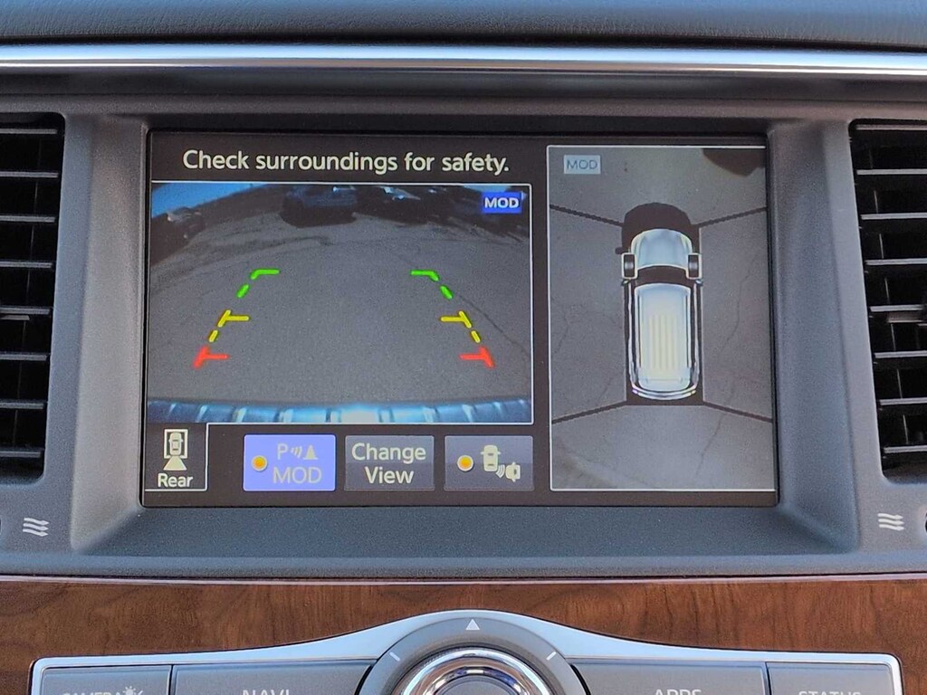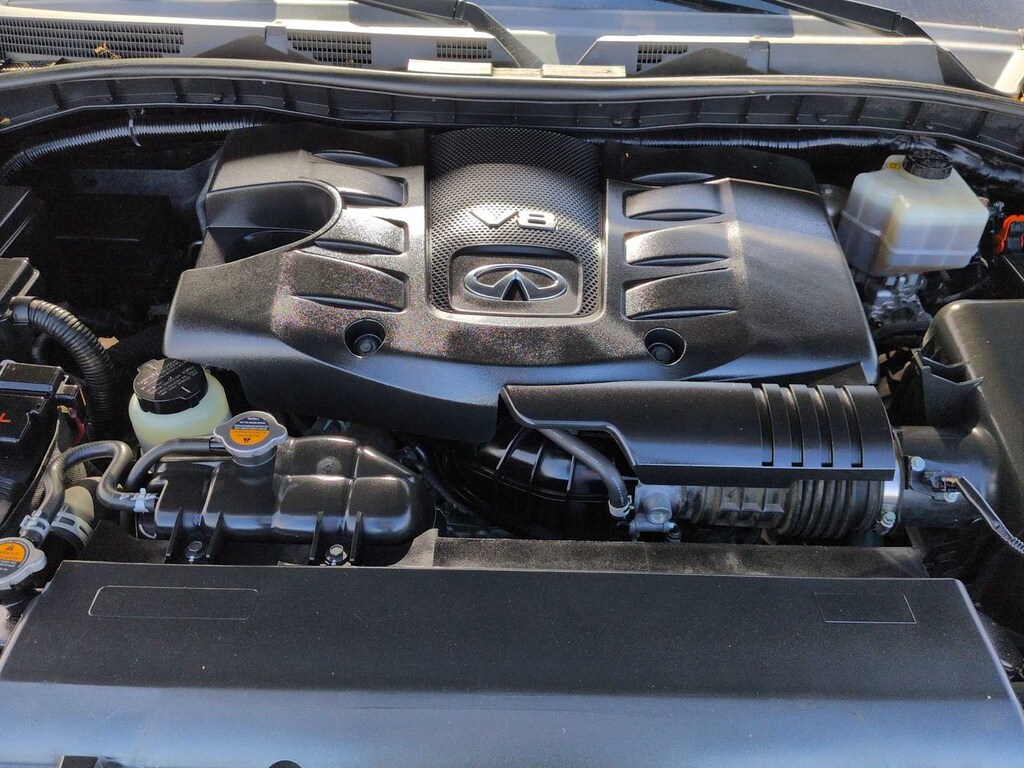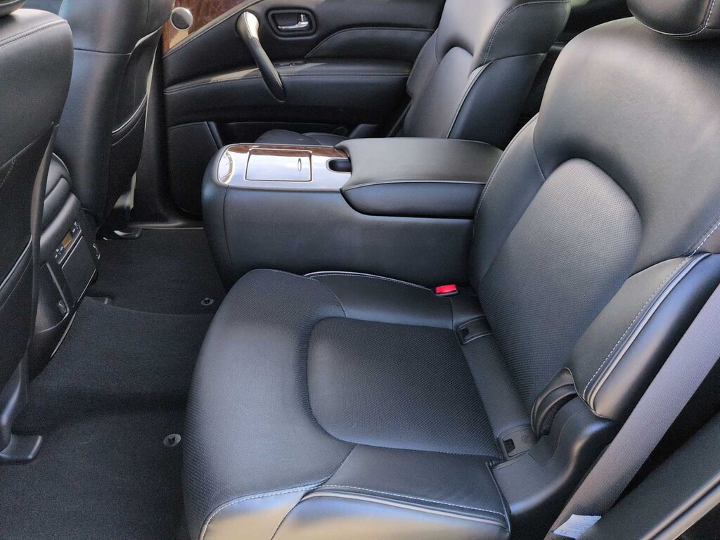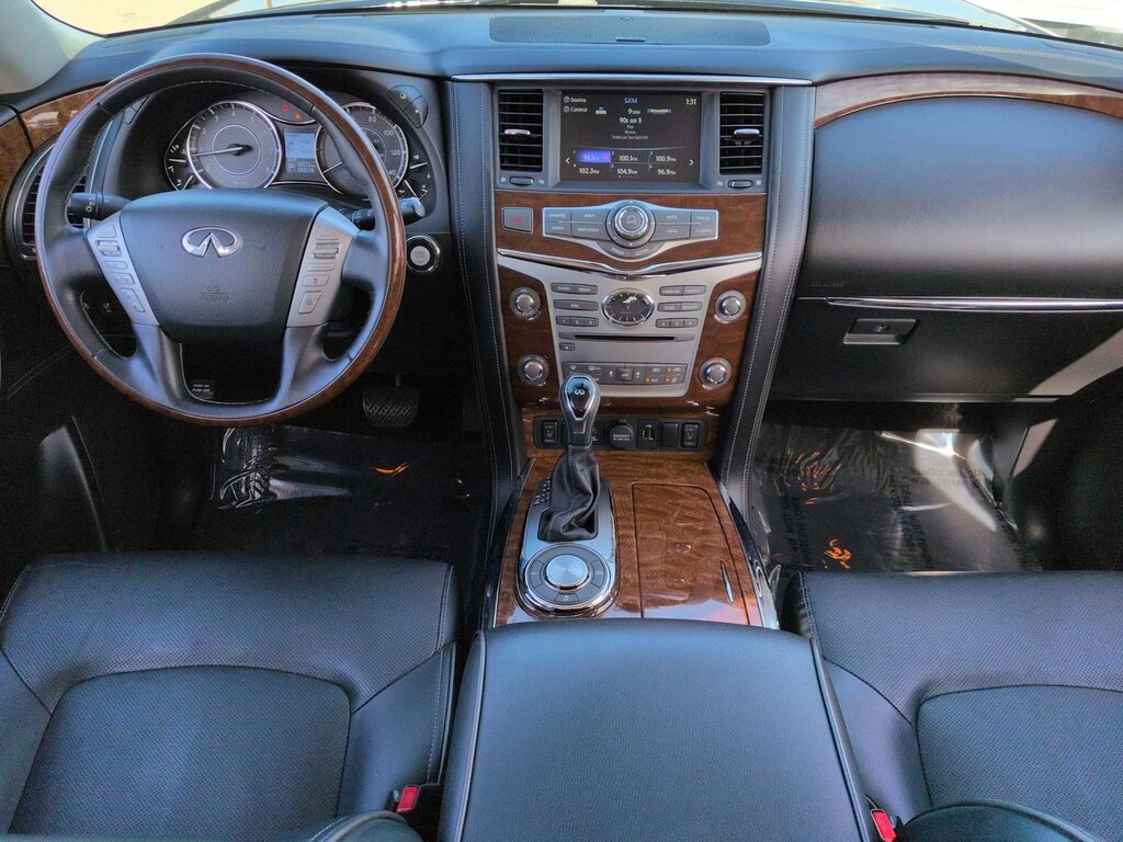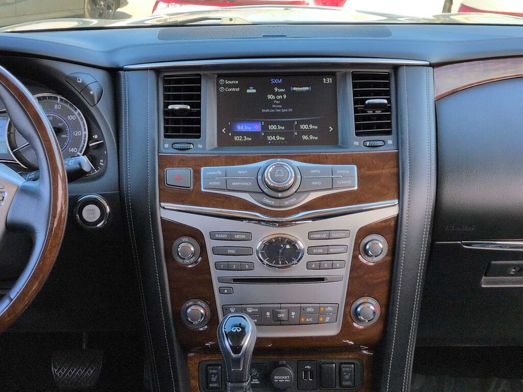 13 Speakers, 2.94 Axle Ratio, 3rd row seats: split-bench, 4-Wheel Disc Brakes, ABS brakes, Air Conditioning, Alloy wheels, AM/FM radio: SiriusXM, Anti-whiplash front head restraints, Auto High-beam Headlights, Auto tilt-away steering wheel, Auto-dimming door mirrors, Auto-dimming Rear-View mirror, Auto-leveling suspension, Automatic temperature control, Backup Collision Intervention (BCI), Blind Spot Intervention (BSI), Blind Spot Warning, Brake assist, Bumpers: body-color, Cargo Package, CD player, Delay-off headlights, Driver door bin, Driver vanity mirror, Dual front impact airbags, Dual front side impact airbags, DVD-Audio, Electronic Stability Control, Emergency communication system: INFINITI Connection, First-Aid Kit, Four wheel independent suspension, Front anti-roll bar, Front Bucket Seats, Front Center Armrest, Front dual zone A/C, Front fog lights, Front reading lights, Fully automatic headlights, Garage door transmitter: HomeLink, Genuine wood console insert, Genuine wood dashboard insert, Genuine wood door panel insert, Heated door mirrors, Heated Front Bucket Seats, Heated front seats, Heated steering wheel, High-Density Non-Slip Rear Cargo Carpet, Illuminated entry, INFINITI Radiant Welcome Lighting, Intelligent Cruise Control (Full-Speed Range), Lane Departure Warning System, Leather Shift Knob, Leather steering wheel, Leather-Appointed Seats w/Stratford Burl Trim, Literature Kit, Low tire pressure warning, Memory seat, Navigation system: INFINITI InTouch Navigation, Nylon-Cord Cargo Net, Occupant sensing airbag, Outside temperature display, Overhead airbag, Overhead console, Panic alarm, Passenger door bin, Passenger vanity mirror, Power door mirrors, Power driver seat, Power Liftgate, Power moonroof, Power passenger seat, Power steering, Power windows, ProASSIST Package, Radiant Illuminated Kick Plates, Radio data system, Radio: AM/FM/HD w/Single In-Dash CD/DVD Player & MP3, Rain sensing wipers, Rear air conditioning, Rear anti-roll bar, Rear audio controls, Rear reading lights, Rear seat center armrest, Rear window defroster, Rear window wiper, Reclining 3rd row seat, Remote keyless entry, Roof rack: rails only, Roof Rail Cross Bars, Security system, Speed control, Speed-sensing steering, Split folding rear seat, Spoiler, Steering wheel memory, Steering wheel mounted audio controls, Tachometer, Telescoping steering wheel, Tilt steering wheel, Traction control, Trip computer, Turn signal indicator mirrors, Variably intermittent wipers, Voltmeter, Wheels: 20 x 8.0 Aluminum-Alloy.