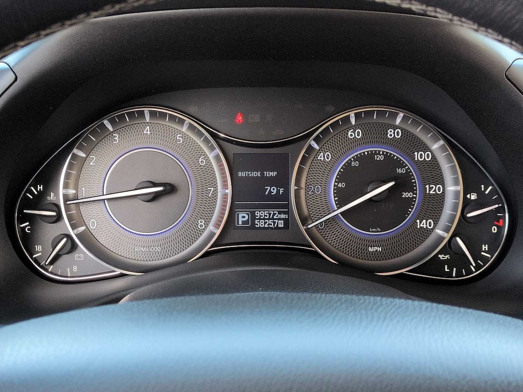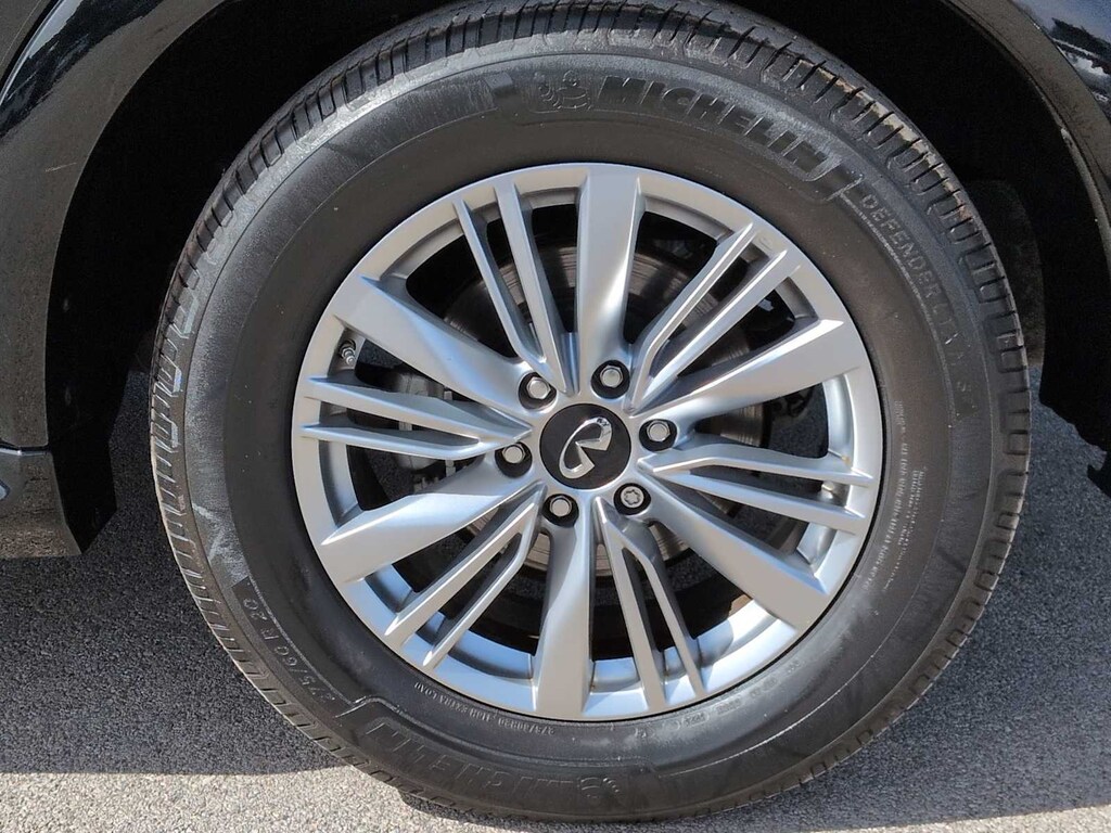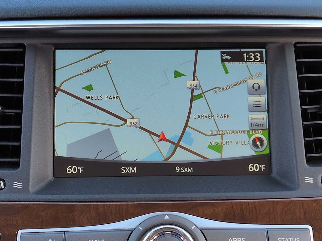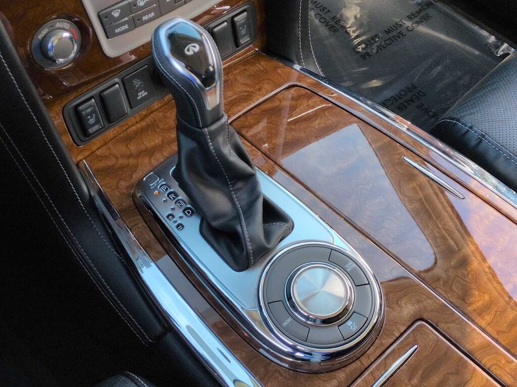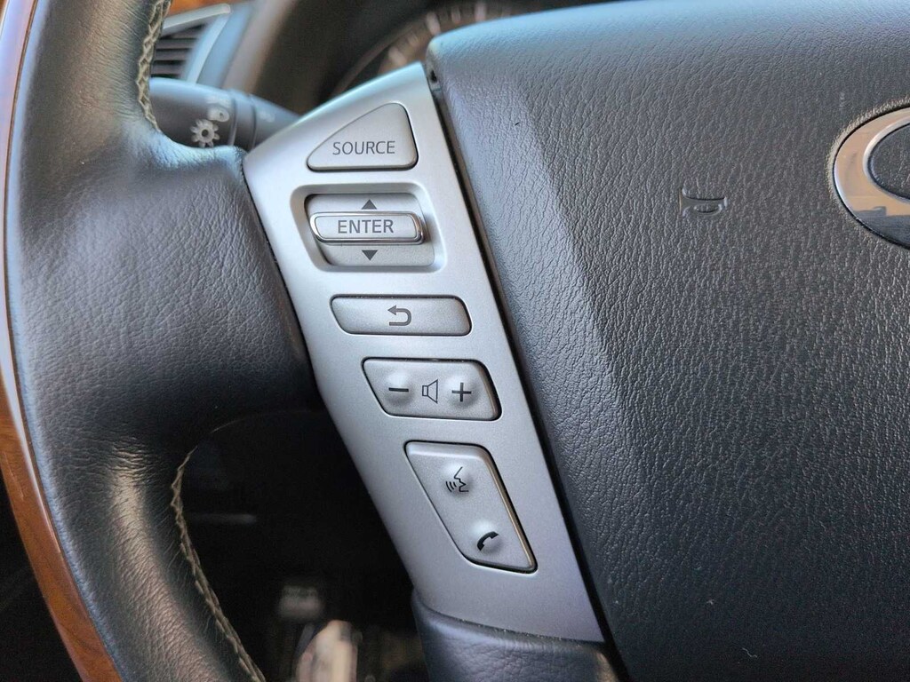 13 Speakers, 2.94 Axle Ratio, 3rd row seats: split-bench, 4-Wheel Disc Brakes, ABS brakes, Air Conditioning, Alloy wheels, AM/FM radio: SiriusXM, Anti-whiplash front head restraints, Auto High-beam Headlights, Auto tilt-away steering wheel, Auto-dimming door mirrors, Auto-dimming Rear-View mirror, Auto-leveling suspension, Automatic temperature control, Backup Collision Intervention (BCI), Blind Spot Intervention (BSI), Blind Spot Warning, Brake assist, Bumpers: body-color, Cargo Package, CD player, Delay-off headlights, Driver door bin, Driver vanity mirror, Dual front impact airbags, Dual front side impact airbags, DVD-Audio, Electronic Stability Control, Emergency communication system: INFINITI Connection, First-Aid Kit, Four wheel independent suspension, Front anti-roll bar, Front Bucket Seats, Front Center Armrest, Front dual zone A/C, Front fog lights, Front reading lights, Fully automatic headlights, Garage door transmitter: HomeLink, Genuine wood console insert, Genuine wood dashboard insert, Genuine wood door panel insert, Heated door mirrors, Heated Front Bucket Seats, Heated front seats, Heated steering wheel, High-Density Non-Slip Rear Cargo Carpet, Illuminated entry, INFINITI Radiant Welcome Lighting, Intelligent Cruise Control (Full-Speed Range), Lane Departure Warning System, Leather Shift Knob, Leather steering wheel, Leather-Appointed Seats w/Stratford Burl Trim, Literature Kit, Low tire pressure warning, Memory seat, Navigation system: INFINITI InTouch Navigation, Nylon-Cord Cargo Net, Occupant sensing airbag, Outside temperature display, Overhead airbag, Overhead console, Panic alarm, Passenger door bin, Passenger vanity mirror, Power door mirrors, Power driver seat, Power Liftgate, Power moonroof, Power passenger seat, Power steering, Power windows, ProASSIST Package, Radiant Illuminated Kick Plates, Radio data system, Radio: AM/FM/HD w/Single In-Dash CD/DVD Player & MP3, Rain sensing wipers, Rear air conditioning, Rear anti-roll bar, Rear audio controls, Rear reading lights, Rear seat center armrest, Rear window defroster, Rear window wiper, Reclining 3rd row seat, Remote keyless entry, Roof rack: rails only, Roof Rail Cross Bars, Security system, Speed control, Speed-sensing steering, Split folding rear seat, Spoiler, Steering wheel memory, Steering wheel mounted audio controls, Tachometer, Telescoping steering wheel, Tilt steering wheel, Traction control, Trip computer, Turn signal indicator mirrors, Variably intermittent wipers, Voltmeter, Wheels: 20 x 8.0 Aluminum-Alloy.