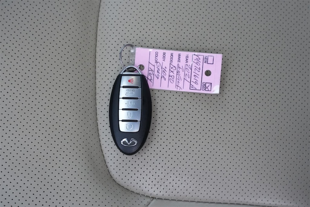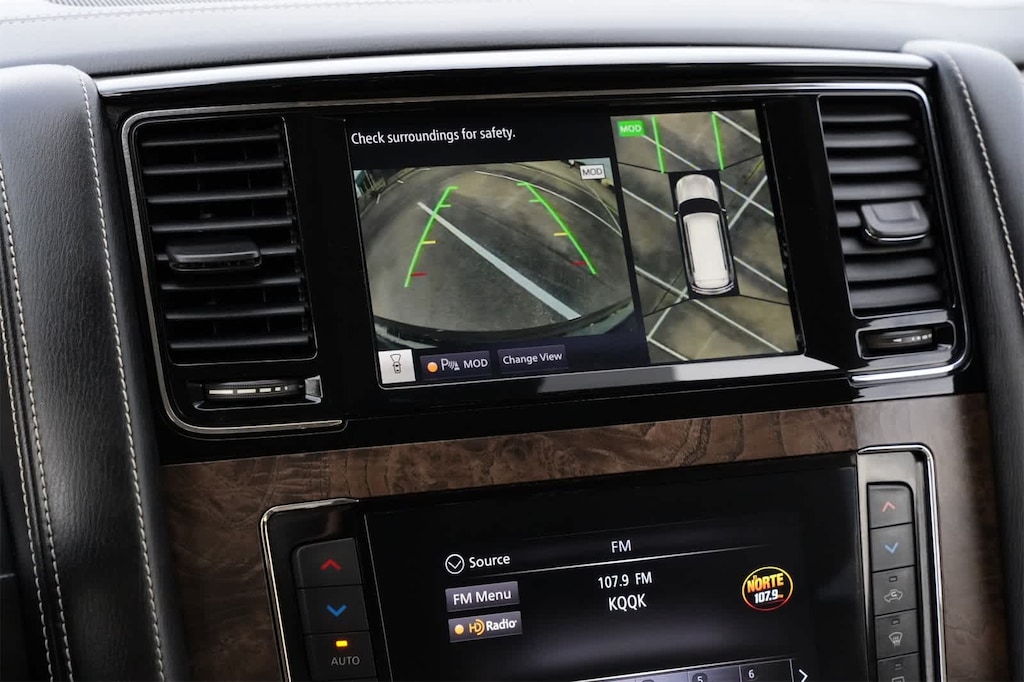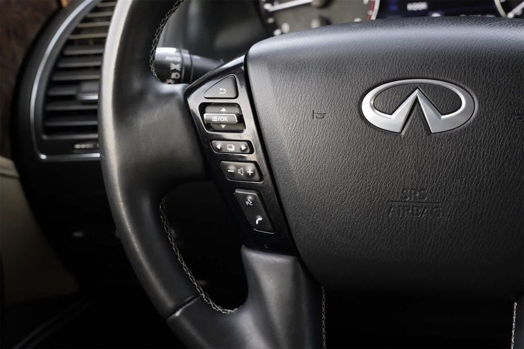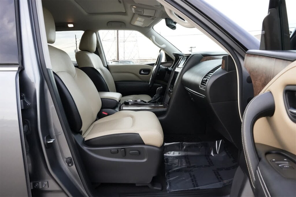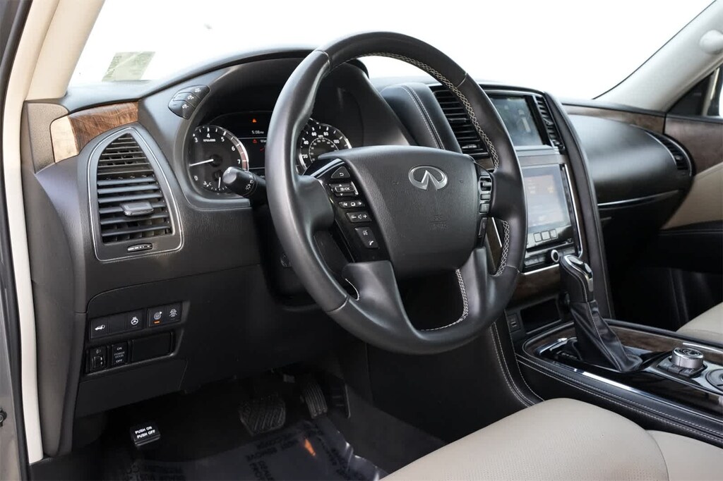 13 Speakers, 2.937 Axle Ratio, 3rd row seats: split-bench, 4-Wheel Disc Brakes, ABS brakes, Air Conditioning, Alloy wheels, AM/FM radio: SiriusXM, Anti-whiplash front head restraints, Apple CarPlay/Android Auto, Auto High-beam Headlights, Auto tilt-away steering wheel, Auto-dimming door mirrors, Auto-dimming Rear-View mirror, Auto-leveling suspension, Automatic temperature control, Brake assist, Bumpers: body-color, Cargo Package, CD player, Compass, Delay-off headlights, Driver door bin, Driver vanity mirror, Dual front impact airbags, Dual front side impact airbags, DVD-Audio, Electronic Stability Control, Emergency communication system: INFINITI Connection, First-Aid Kit, Four wheel independent suspension, Front anti-roll bar, Front Bucket Seats, Front Center Armrest, Front dual zone A/C, Front fog lights, Front reading lights, Fully automatic headlights, Garage door transmitter: HomeLink, Heated door mirrors, Heated Front Bucket Seats, Heated front seats, Heated steering wheel, High-Density Non-Slip Rear Cargo Carpet, Illuminated entry, Leather Shift Knob, Leather steering wheel, Leather-Appointed Seats, Literature Kit, Low tire pressure warning, Memory seat, Navigation system: INFINITI InTouch Navigation, Nylon-Cord Cargo Net, Occupant sensing airbag, Outside temperature display, Overhead airbag, Overhead console, Panic alarm, Passenger door bin, Passenger vanity mirror, Power door mirrors, Power driver seat, Power Liftgate, Power moonroof, Power passenger seat, Power steering, Power windows, Premium Select Sahara Stone Interior, Radiant Illuminated Kick Plates, Radio data system, Radio: Bose Audio System w/13 Speakers, Rain sensing wipers, Rear air conditioning, Rear anti-roll bar, Rear audio controls, Rear reading lights, Rear seat center armrest, Rear window defroster, Rear window wiper, Reclining 3rd row seat, Remote keyless entry, Roof Rail Cross Bars, Security system, Speed control, Speed-sensing steering, Split folding rear seat, Spoiler, Steering wheel memory, Steering wheel mounted audio controls, Tachometer, Telescoping steering wheel, Tilt steering wheel, Traction control, Trip computer, Turn signal indicator mirrors, Variably intermittent wipers, Voltmeter, Wheels: 22 x 8.0 Dark Forged Aluminum-Alloy.