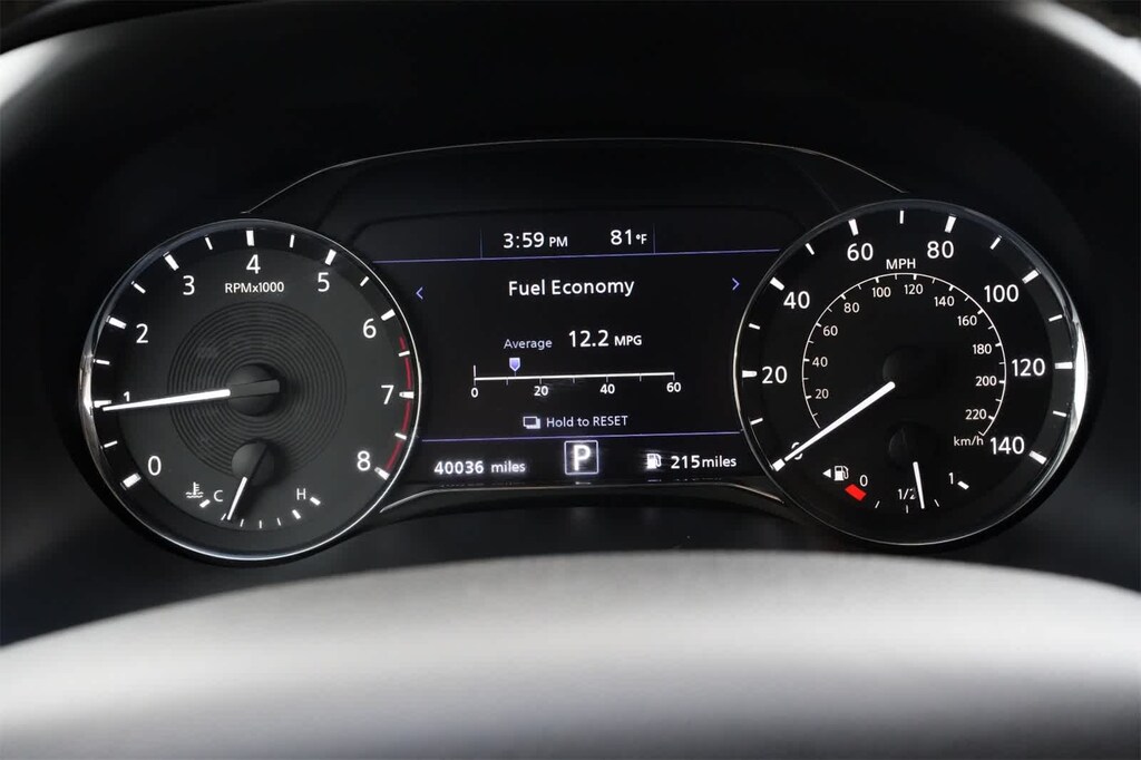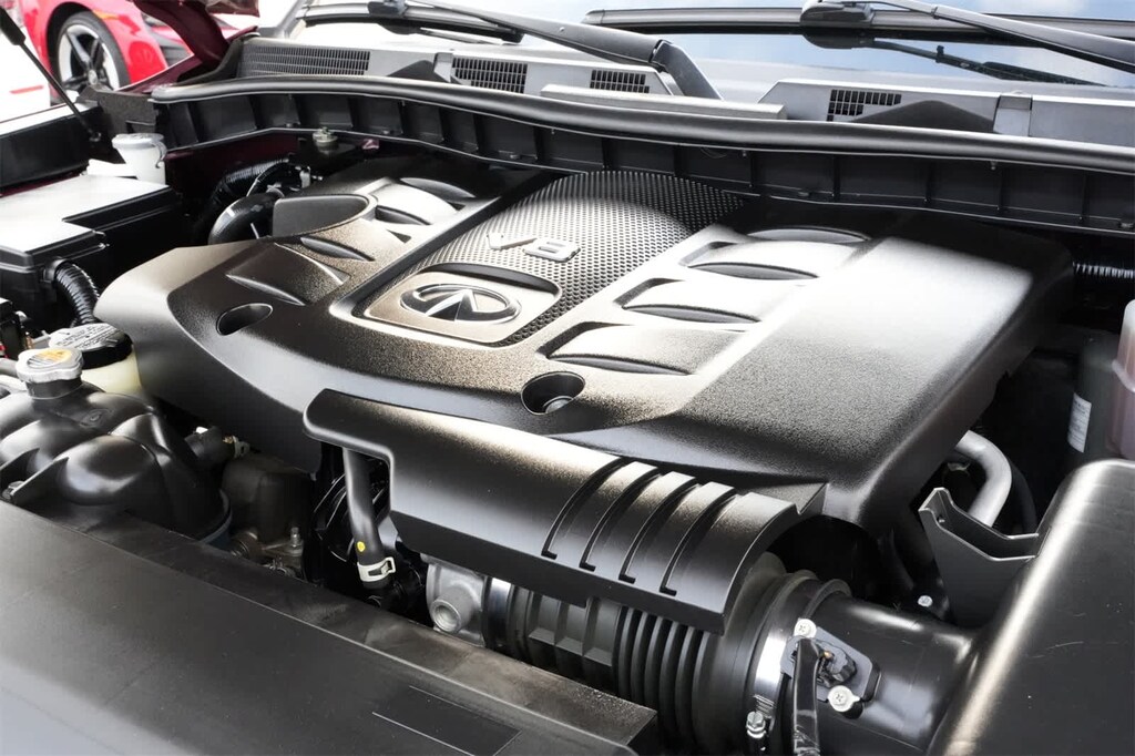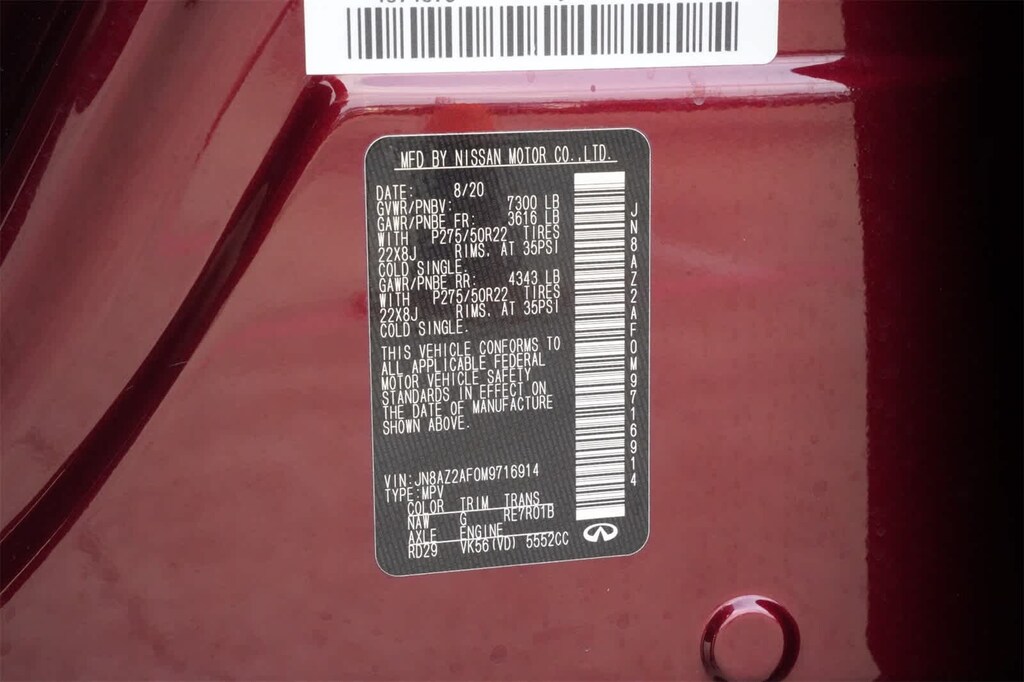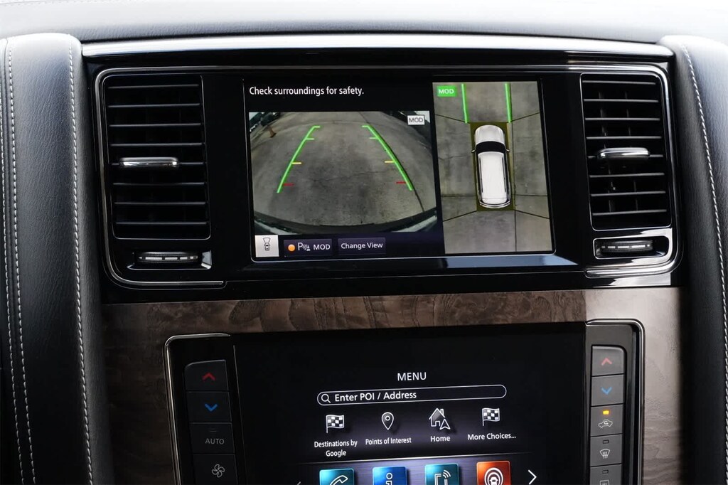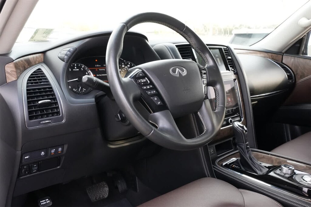 13 Speakers, 2.937 Axle Ratio, 3rd row seats: split-bench, 4-Wheel Disc Brakes, ABS brakes, Air Conditioning, Alloy wheels, AM/FM radio: SiriusXM, Anti-whiplash front head restraints, Apple CarPlay/Android Auto, Auto High-beam Headlights, Auto tilt-away steering wheel, Auto-dimming door mirrors, Auto-dimming Rear-View mirror, Auto-leveling suspension, Automatic temperature control, Brake assist, Bumpers: body-color, Cargo Package, CD player, Compass, Delay-off headlights, Driver door bin, Driver vanity mirror, Dual front impact airbags, Dual front side impact airbags, DVD-Audio, Electronic Stability Control, Emergency communication system: INFINITI Connection, First-Aid Kit, Four wheel independent suspension, Front anti-roll bar, Front Bucket Seats, Front Center Armrest, Front dual zone A/C, Front fog lights, Front reading lights, Fully automatic headlights, Garage door transmitter: HomeLink, Heated door mirrors, Heated Front Bucket Seats, Heated front seats, Heated steering wheel, High-Density Non-Slip Rear Cargo Carpet, Illuminated entry, Leather Shift Knob, Leather steering wheel, Leather-Appointed Seats, Literature Kit, Low tire pressure warning, Memory seat, Navigation system: INFINITI InTouch Navigation, Nylon-Cord Cargo Net, Occupant sensing airbag, Outside temperature display, Overhead airbag, Overhead console, Panic alarm, Passenger door bin, Passenger vanity mirror, Power door mirrors, Power driver seat, Power Liftgate, Power moonroof, Power passenger seat, Power steering, Power windows, Premium Select Truffle Brown Interior, Radiant Illuminated Kick Plates, Radio data system, Radio: Bose Audio System w/13 Speakers, Rain sensing wipers, Rear air conditioning, Rear anti-roll bar, Rear audio controls, Rear reading lights, Rear seat center armrest, Rear window defroster, Rear window wiper, Reclining 3rd row seat, Remote keyless entry, Roof Rail Cross Bars, Security system, Speed control, Speed-sensing steering, Split folding rear seat, Spoiler, Steering wheel memory, Steering wheel mounted audio controls, Tachometer, Telescoping steering wheel, Tilt steering wheel, Traction control, Trip computer, Turn signal indicator mirrors, Variably intermittent wipers, Voltmeter, Wheels: 22 x 8.0 Dark Forged Aluminum-Alloy.