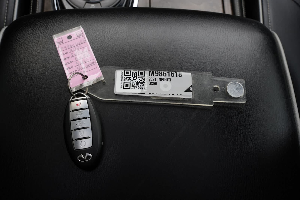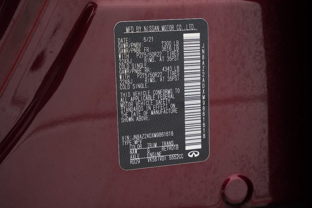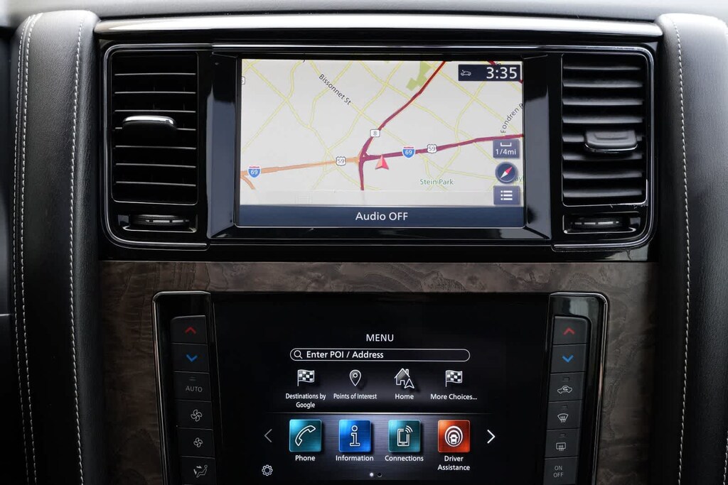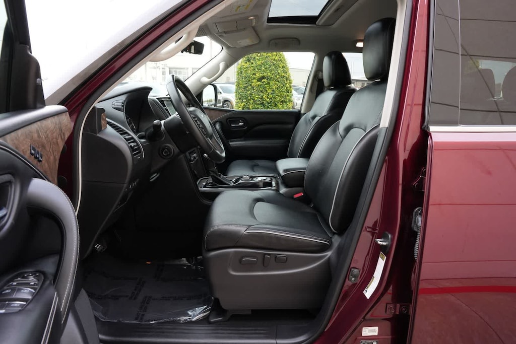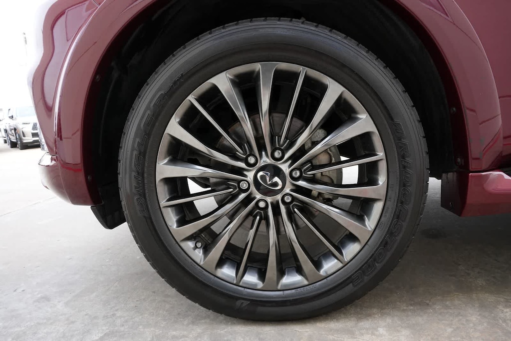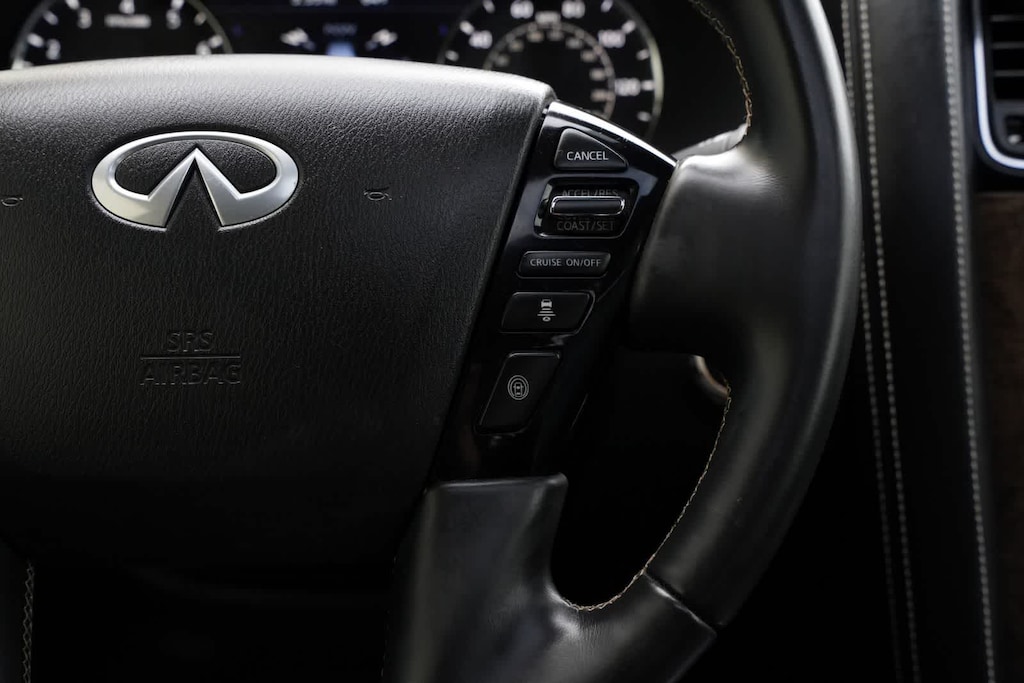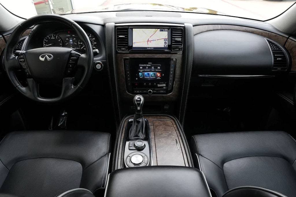 13 Speakers, 2.937 Axle Ratio, 3rd row seats: split-bench, 4-Wheel Disc Brakes, ABS brakes, Air Conditioning, Alloy wheels, AM/FM radio: SiriusXM, Anti-whiplash front head restraints, Apple CarPlay/Android Auto, Auto High-beam Headlights, Auto tilt-away steering wheel, Auto-dimming door mirrors, Auto-dimming Rear-View mirror, Auto-leveling suspension, Automatic temperature control, Brake assist, Bumpers: body-color, Cargo Package, CD player, Compass, Delay-off headlights, Driver door bin, Driver vanity mirror, Dual front impact airbags, Dual front side impact airbags, DVD-Audio, Electronic Stability Control, Emergency communication system: INFINITI Connection, First-Aid Kit, Four wheel independent suspension, Front anti-roll bar, Front Bucket Seats, Front Center Armrest, Front dual zone A/C, Front fog lights, Front reading lights, Fully automatic headlights, Garage door transmitter: HomeLink, Heated door mirrors, Heated Front Bucket Seats, Heated front seats, Heated steering wheel, High-Density Non-Slip Rear Cargo Carpet, Illuminated Cargo Scuff Plates, Illuminated entry, Leather Shift Knob, Leather steering wheel, Leather-Appointed Seats, Literature Kit, Low tire pressure warning, Memory seat, Navigation system: INFINITI InTouch Navigation, Nylon-Cord Cargo Net, Occupant sensing airbag, Outside temperature display, Overhead airbag, Overhead console, Panic alarm, Passenger door bin, Passenger vanity mirror, Power door mirrors, Power driver seat, Power Liftgate, Power moonroof, Power passenger seat, Power steering, Power windows, Radiant Illuminated Kick Plates, Radio data system, Radio: Bose Audio System w/13 Speakers, Rain sensing wipers, Rear air conditioning, Rear anti-roll bar, Rear audio controls, Rear reading lights, Rear seat center armrest, Rear window defroster, Rear window wiper, Reclining 3rd row seat, Remote keyless entry, Roof Rail Cross Bars, Security system, Speed control, Speed-sensing steering, Split Bench Seat Package, Split folding rear seat, Spoiler, Steering wheel memory, Steering wheel mounted audio controls, Tachometer, Telescoping steering wheel, Tilt steering wheel, Traction control, Trip computer, Turn signal indicator mirrors, Variably intermittent wipers, Voltmeter, Wheels: 22 x 8.0 Dark Forged Aluminum-Alloy.