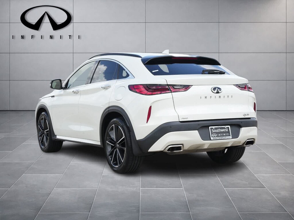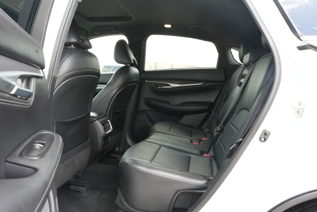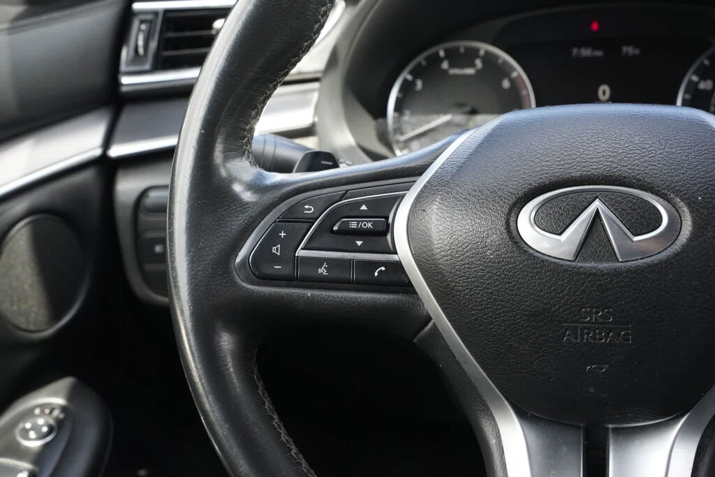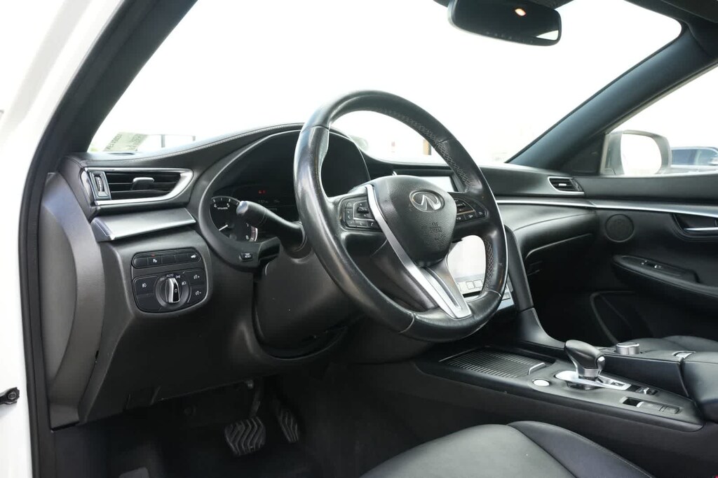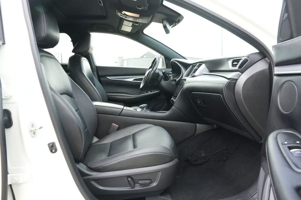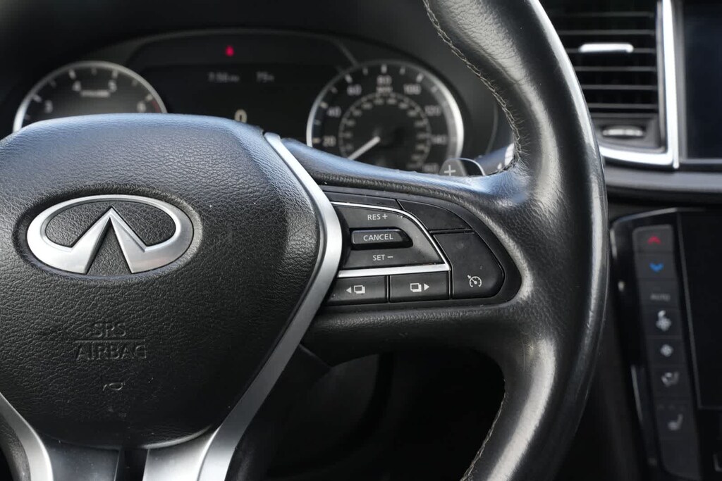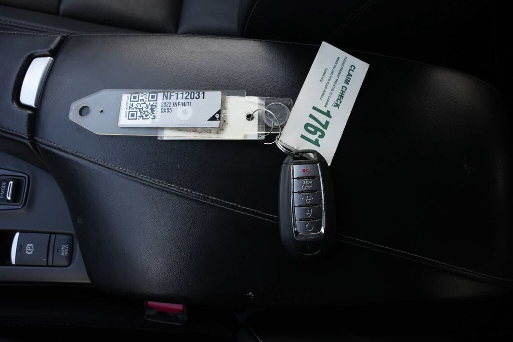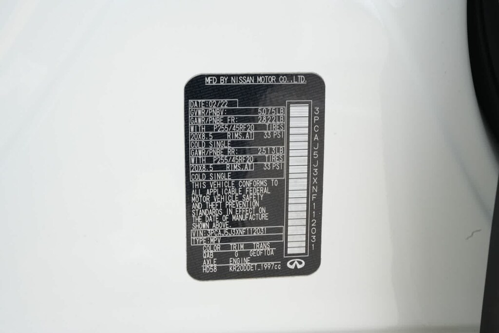 4-Wheel Disc Brakes, 5.846 Axle Ratio, 6 Speakers, ABS brakes, Air Conditioning, Alloy wheels, AM/FM radio: SiriusXM, AM/FM/CD Audio System, Auto High-beam Headlights, Auto-dimming Rear-View mirror, Automatic temperature control, Black Film Rear Bumper Protector, Black Splash Guards (Set of 4), Blind Spot Warning, Brake assist, Bumpers: body-color, Cargo Net, Cargo Package, Carpeted Floor Mats, CD player, Delay-off headlights, Driver door bin, Driver vanity mirror, Dual front impact airbags, Dual front side impact airbags, Electronic Stability Control, Emergency communication system: INFINITI InTouch, Exterior Parking Camera Rear, Four wheel independent suspension, Front anti-roll bar, Front Bucket Seats, Front Center Armrest, Front dual zone A/C, Front fog lights, Front reading lights, Fully automatic headlights, Garage door transmitter: HomeLink, Heated Front Bucket Seats, Heated front seats, Illuminated entry, Knee airbag, Leather Shift Knob, Leatherette Seat Trim, Low tire pressure warning, Occupant sensing airbag, Outside temperature display, Overhead airbag, Overhead console, Panic alarm, Passenger door bin, Passenger vanity mirror, Power door mirrors, Power driver seat, Power Liftgate, Power moonroof, Power passenger seat, Power steering, Power windows, Premium Paint, Radio data system, Rear anti-roll bar, Rear Parking Sensors, Rear reading lights, Rear seat center armrest, Rear window defroster, Rear window wiper, Remote keyless entry, Reversible Cargo Mat, Security system, Speed control, Speed-sensing steering, Speed-Sensitive Wipers, Split folding rear seat, Spoiler, Steering wheel mounted audio controls, Tachometer, Telescoping steering wheel, Tilt steering wheel, Traction control, Trip computer, Turn signal indicator mirrors, Variably intermittent wipers, Wheels: 20 x 8.5 Machine Finish Aluminum Alloy.