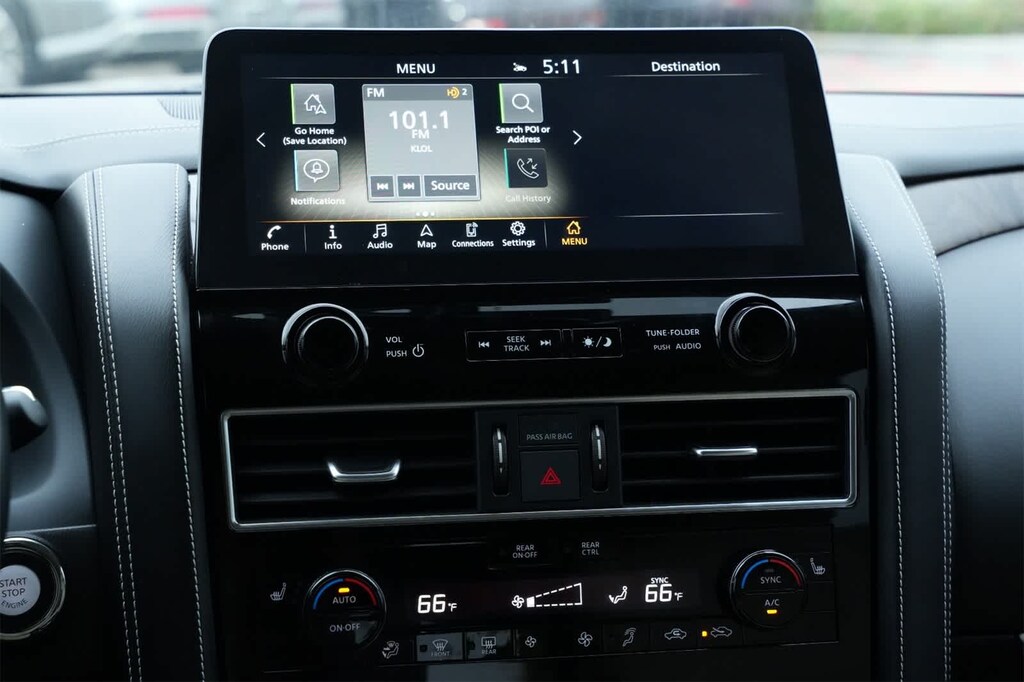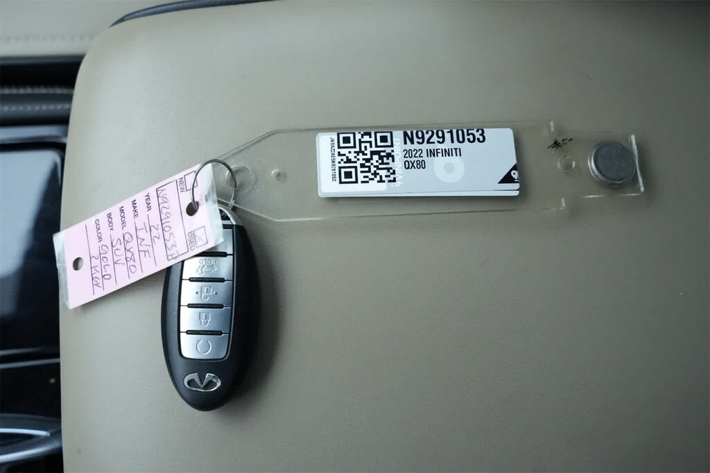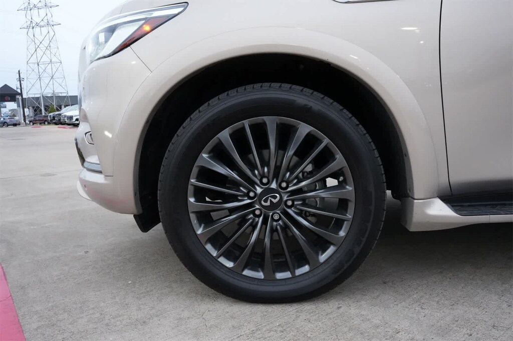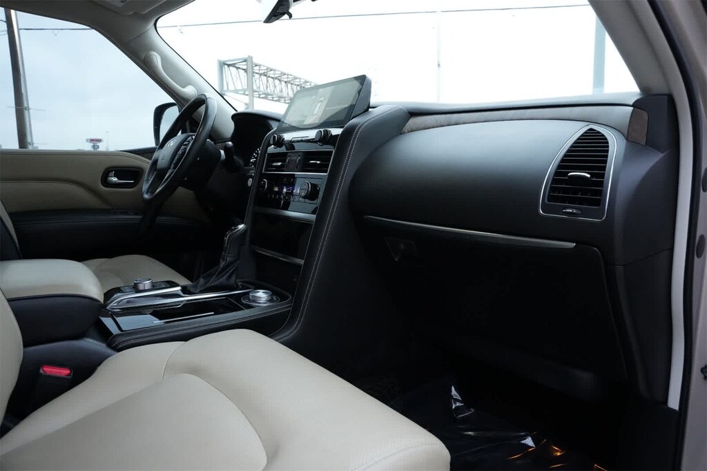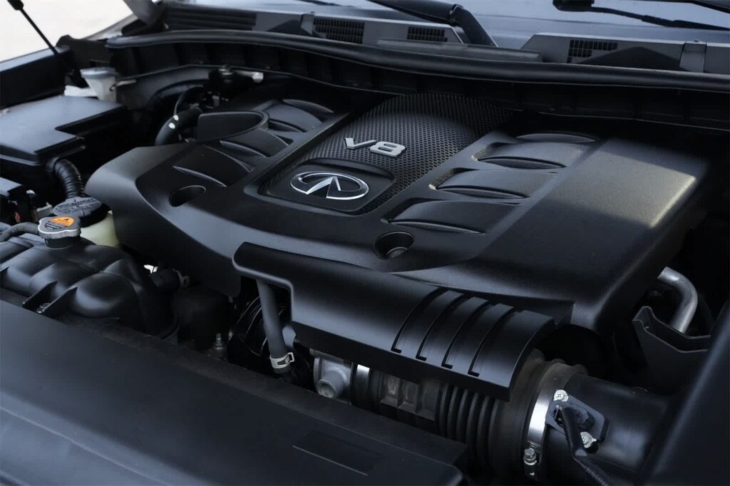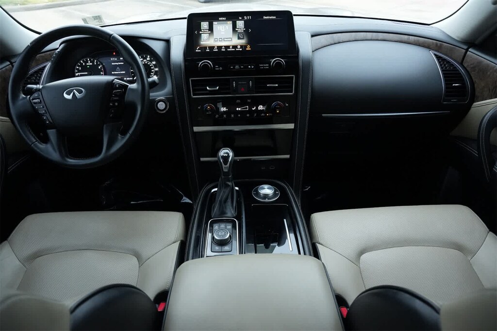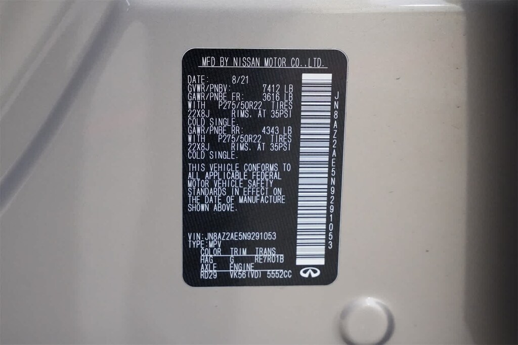 13 Speakers, 2.937 Axle Ratio, 3rd row seats: split-bench, 4-Wheel Disc Brakes, ABS brakes, Air Conditioning, Alloy wheels, AM/FM radio: SiriusXM, Anti-whiplash front head restraints, Auto High-beam Headlights, Auto tilt-away steering wheel, Auto-dimming door mirrors, Auto-dimming Rear-View mirror, Auto-leveling suspension, Automatic temperature control, Brake assist, Bumpers: body-color, Cargo Package, Compass, Console Net, Delay-off headlights, Driver door bin, Driver vanity mirror, Dual front impact airbags, Dual front side impact airbags, Electronic Stability Control, Emergency communication system: INFINITI InTouch w/1-year trial, First-Aid Kit, Four wheel independent suspension, Front anti-roll bar, Front Bucket Seats, Front Center Armrest, Front dual zone A/C, Front fog lights, Front reading lights, Fully automatic headlights, Garage door transmitter: HomeLink, Heated door mirrors, Heated Front Bucket Seats, Heated front seats, Heated steering wheel, High-Density Non-Slip Rear Cargo Carpet, Illuminated entry, INFINITI Radiant Illuminated Kick Plates, Leather Shift Knob, Leather steering wheel, Leather-Appointed Seats, Literature Kit, Low tire pressure warning, Memory seat, Navigation system: INFINITI InTouch Navigation, Nylon-Cord Cargo Net, Occupant sensing airbag, Outside temperature display, Overhead airbag, Overhead console, Panic alarm, Passenger door bin, Passenger vanity mirror, Power door mirrors, Power driver seat, Power Liftgate, Power moonroof, Power passenger seat, Power steering, Power windows, Premium audio system: Bose, Premium Select Sahara Stone Interior, Radio data system, Radio: Bose Premium Audio System w/13 Speakers, Rain sensing wipers, Rear air conditioning, Rear anti-roll bar, Rear reading lights, Rear seat center armrest, Rear window defroster, Rear window wiper, Reclining 3rd row seat, Remote keyless entry, Roof Rail Cross Bars, Security system, Speed control, Speed-sensing steering, Split folding rear seat, Spoiler, Steering wheel memory, Steering wheel mounted audio controls, Tachometer, Telescoping steering wheel, Tilt steering wheel, Traction control, Trip computer, Turn signal indicator mirrors, Variably intermittent wipers, Voltmeter, Wheels: 22 x 8.0 Dark Cast Chrome Aluminum-Alloy.