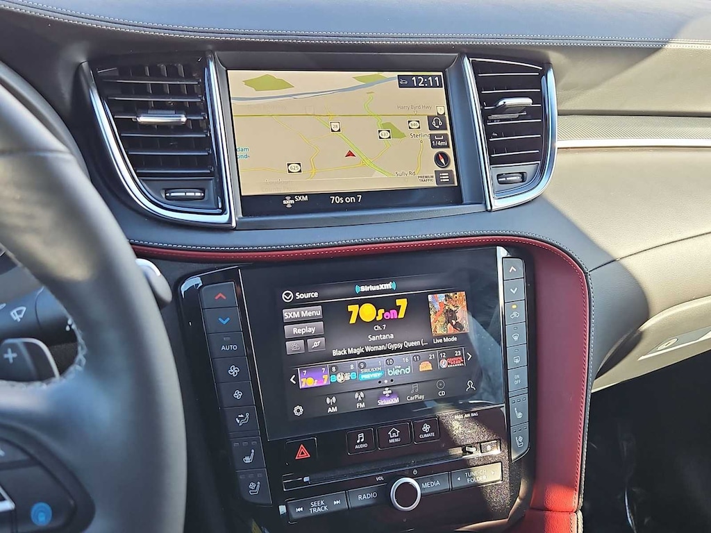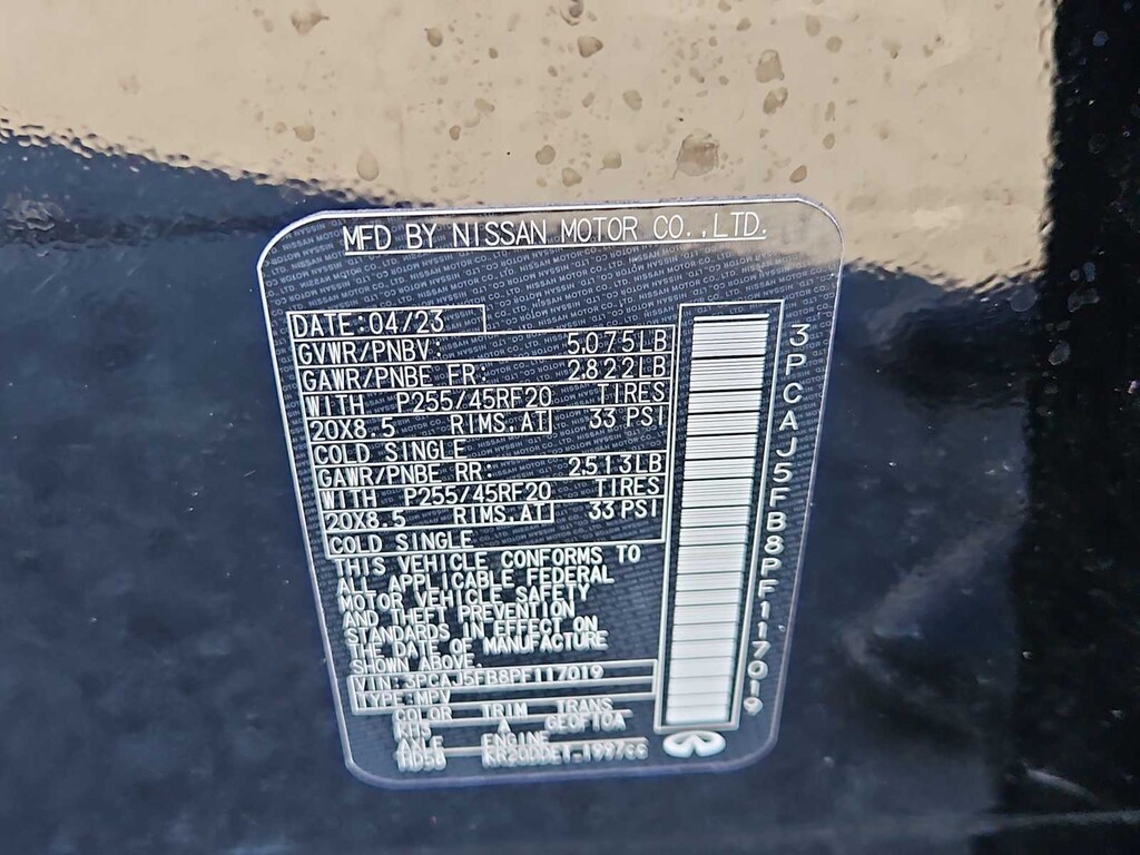 12 Speakers, 4-Wheel Disc Brakes, 5.846 Axle Ratio, ABS brakes, Air Conditioning, Alloy wheels, AM/FM radio: SiriusXM, Auto High-beam Headlights, Auto-dimming Rear-View mirror, Automatic temperature control, Bose Premium Audio System, Brake assist, Bumpers: body-color, CD player, Climate Controlled Front Bucket Seats, Delay-off headlights, Driver door bin, Driver vanity mirror, Dual front impact airbags, Dual front side impact airbags, Electronic Stability Control, Emergency communication system: INFINITI InTouch (1-year complimentary trial), Floor Mats, Four wheel independent suspension, Front anti-roll bar, Front Bucket Seats, Front Center Armrest, Front dual zone A/C, Front fog lights, Front reading lights, Fully automatic headlights, Garage door transmitter: HomeLink, Heated door mirrors, Heated front seats, Heated steering wheel, Illuminated entry, Illuminated Kick Plates, Knee airbag, Leather Shift Knob, Leather steering wheel, Literature Kit, Low tire pressure warning, Memory seat, Navigation system: INFINITI InTouch Navigation, Occupant sensing airbag, Outside temperature display, Overhead airbag, Overhead console, Panic alarm, Passenger door bin, Passenger vanity mirror, Power door mirrors, Power driver seat, Power Liftgate, Power moonroof, Power passenger seat, Power steering, Power windows, Radio data system, Rear anti-roll bar, Rear reading lights, Rear seat center armrest, Rear side impact airbag, Rear window defroster, Rear window wiper, Remote keyless entry, Security system, Semi-Aniline Leather-Appointed Seat Trim, Speed control, Speed-sensing steering, Speed-Sensitive Wipers, Splash Guards (Set of 4), Split folding rear seat, Spoiler, Steering wheel mounted audio controls, Tachometer, Telescoping steering wheel, Tilt steering wheel, Traction control, Trip computer, Turn signal indicator mirrors, Variably intermittent wipers, Ventilated front seats, and Wheels: 20 Black Painted Machine Finished.