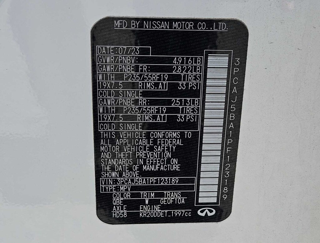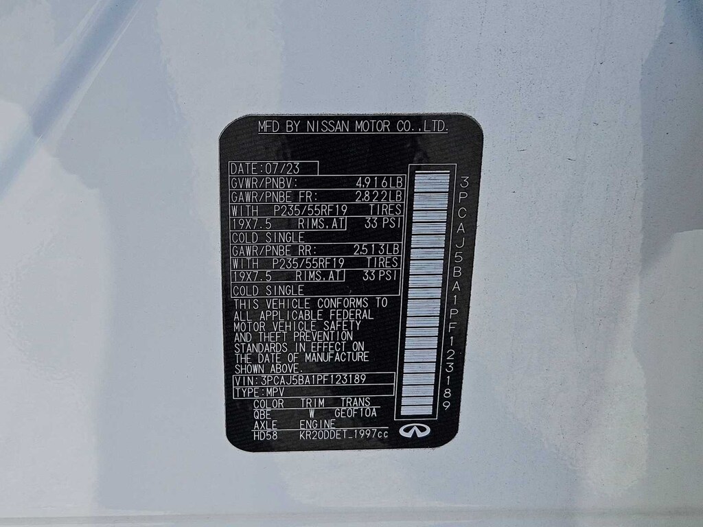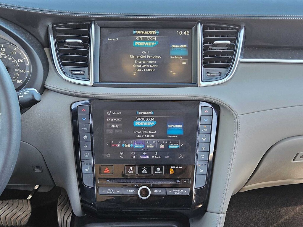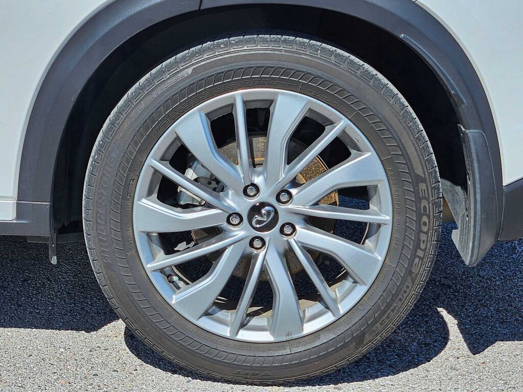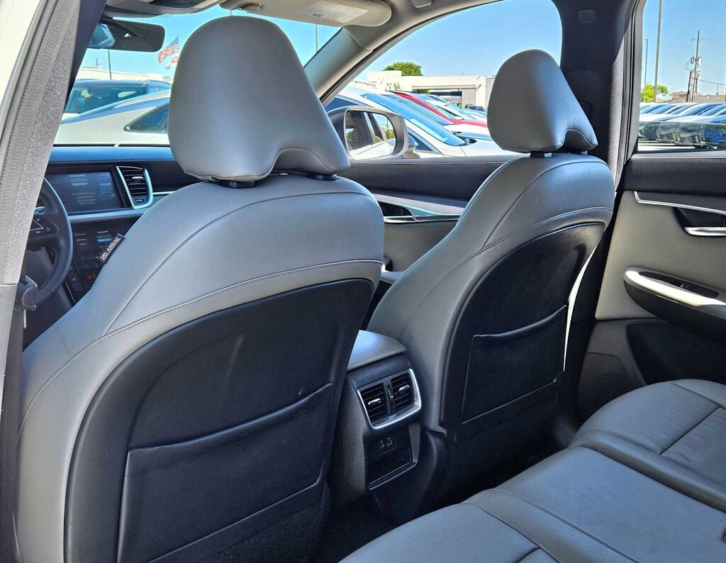 4-Wheel Disc Brakes, ABS brakes, Dual front impact airbags, Dual front side impact airbags, Emergency communication system: INFINITI InTouch (1-year complimentary trial), Four wheel independent suspension, Front anti-roll bar, Knee airbag, Low tire pressure warning, Occupant sensing airbag, Overhead airbag, Power driver seat, Power Liftgate, Power moonroof, Rear anti-roll bar, Rear side impact airbag, Remote keyless entry, Speed-sensing steering, Steering wheel mounted audio controls, Traction control.