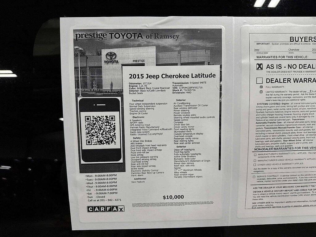 Cherokee Latitude, 4D Sport Utility, 3.2L V6, 9-Speed 948TE Automatic, 4WD, Brilliant Black Crystal Pearlcoat. Clean CARFAX. Brilliant Black Crystal Pearlcoat 2015 Jeep Cherokee Latitude 4WD 9-Speed 948TE Automatic 3.2L V6