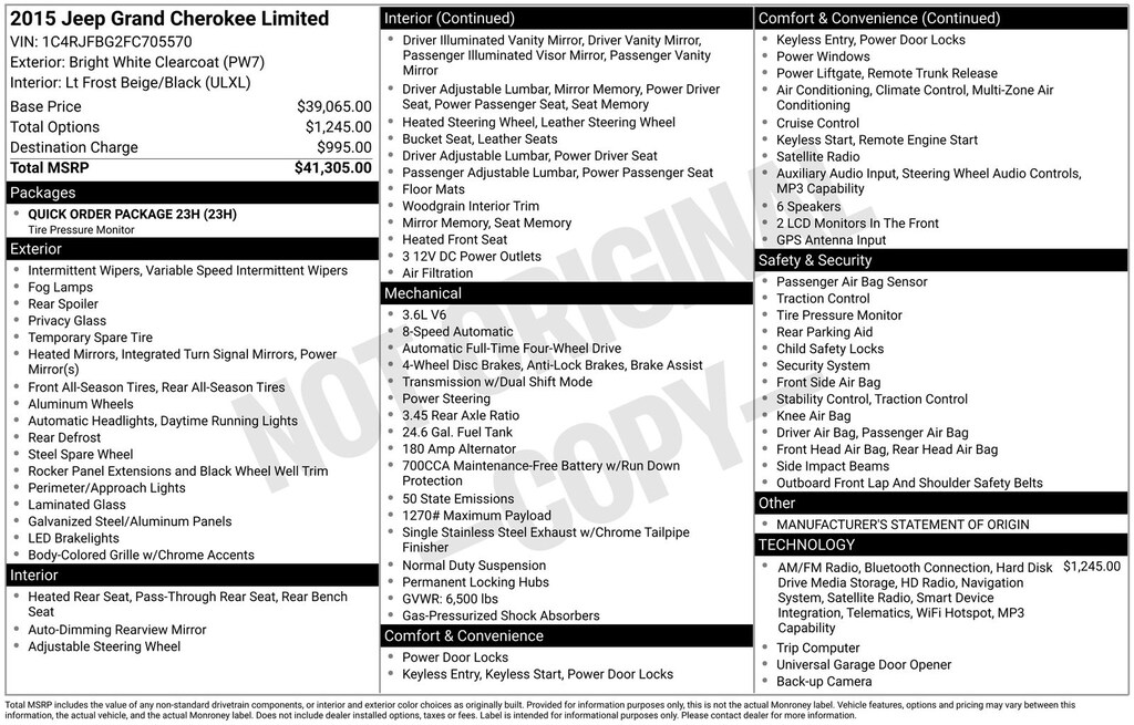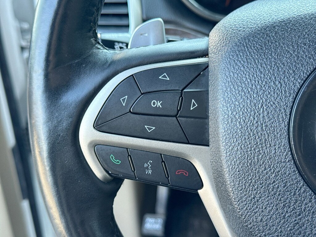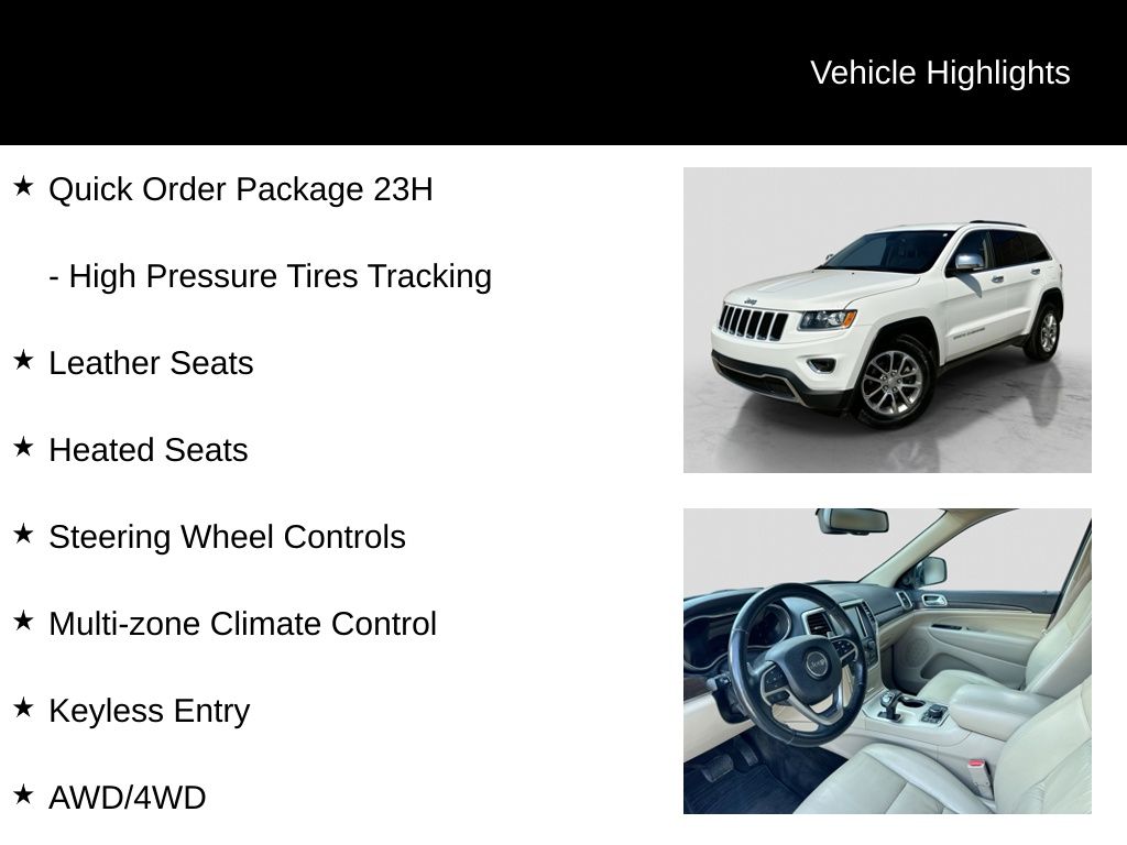 Recent Arrival! 2015 Jeep Grand Cherokee Limited Is nicely equipped with Quick Order Package 23H (High Pressure Tires Tracking), 4WD, GPS Navigation, 1-Yr SiriusXM Traffic Service, 1-Yr SIRIUSXM Travel Link Service, 18" x 8.0" Aluminum Polished Wheels, 3.45 Rear Axle Ratio, 4-Wheel Disc Brakes, 6 Month Trial (Registration Required), 6 Speakers, 8.4" Touchscreen Display, ABS brakes, Air Conditioning, Alloy wheels, AM/FM radio: SiriusXM, Anti-whiplash front head restraints, Audio memory, Auto-dimming door mirrors, Auto-dimming Rear-View mirror, Automatic temperature control, Brake assist, Bumpers: body-color, Compass, Delay-off headlights, Driver door bin, Driver vanity mirror, Dual front impact airbags, Dual front side impact airbags, Electronic Stability Control, Exterior Parking Camera Rear, For Details Visit DriveUconnect.com, Four wheel independent suspension, Front anti-roll bar, Front Bucket Seats, Front Center Armrest w/Storage, Front dual zone A/C, Front fog lights, Front reading lights, Fully automatic headlights, Garage door transmitter, GPS Antenna Input, HD Radio, Heated door mirrors, Heated front seats, Heated rear seats, Heated steering wheel, Illuminated entry, Integrated Voice Command w/Bluetooth, Knee airbag, Leather Shift Knob, Low tire pressure warning, Manufacturer's Statement of Origin, Memory seat, Normal Duty Suspension, Occupant sensing airbag, Outside temperature display, Overhead airbag, Overhead console, Panic alarm, Passenger door bin, Passenger vanity mirror, Power door mirrors, Power driver seat, Power Liftgate, Power passenger seat, Power steering, Power windows, Premium Leather Trimmed Bucket Seats, Radio data system, Radio: Uconnect 5.0, Radio: Uconnect 8.4 NAV, Rear anti-roll bar, Rear Parking Sensors, Rear reading lights, Rear seat center armrest, Rear window defroster, Rear window wiper, Rear-View Auto-Dimming Mirror w/Microphone, Remote keyless entry, Roadside Assistance & 9-1-1 Call, Roof rack: rails only, Security system, SIRIUSXM Satellite Radio, SIRIUSXM Traffic, SiriusXM Travel Link, Speed control, Speed-Sensitive Wipers, Split folding rear seat, Spoiler, Steering wheel mounted audio controls, Tachometer, Telescoping steering wheel, Tilt steering wheel, Traction control, Trip computer, Turn signal indicator mirrors, Uconnect Access, and Variably intermittent wiperS.