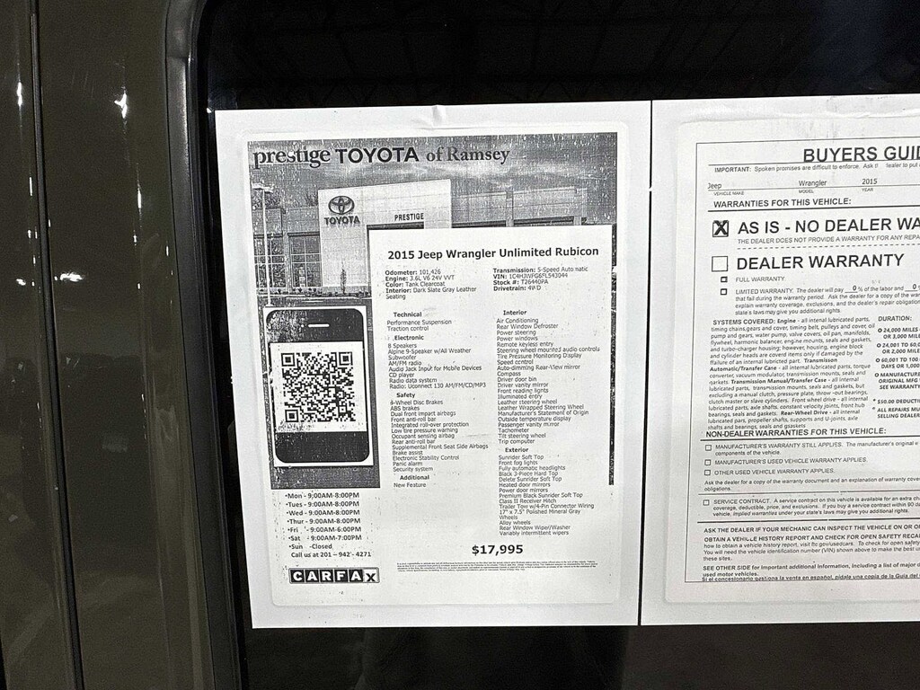 This 2015 Jeep Wrangler Unlimited Rubicon will not make it to the weekend!! CALL NOW to reserve your test drive!! (844) 838-7075 Please Visit www.PrestigeToyota.com for further details. Price does not include licensing costs, registration fees, taxes and dealer doc fee of $999 which are to be paid by the consumer.