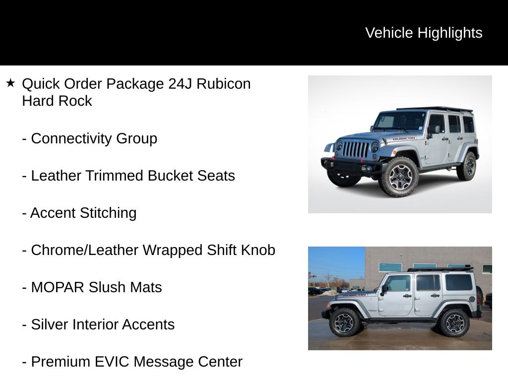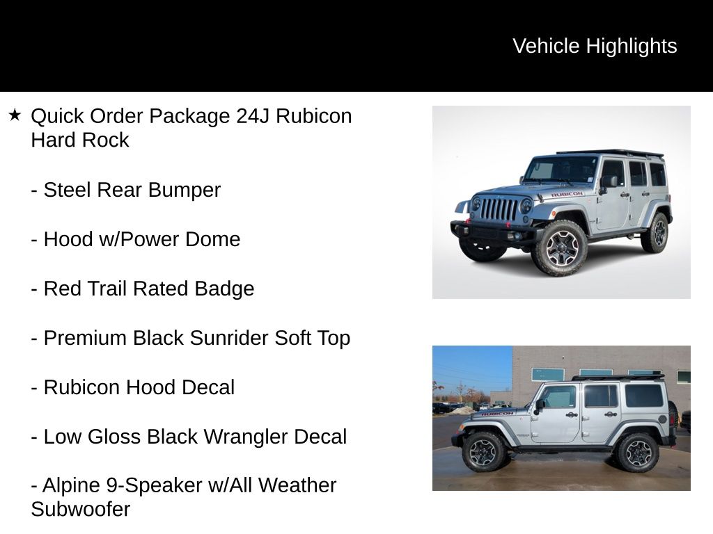 **Super Clean and Well Taken Care Of**, Backup Camera, Bluetooth, Hands-Free, Trailer package, Leather Seats, Heated Seats, Steering Wheel Controls, Multi-zone Climate Control, Premium Wheels, Keyless Entry, AWD/4WD, Non-Smoker, All Maintenance Upto date!!, Fully Reconditioned and Professionally Detailed!, Must See and Drive to appreciate this great value!!, 40GB Hard Drive w/28GB Available, 5-Year SiriusXM Travel Link Service, 6.5" Touchscreen Display, Accent Stitching, Alpine 9-Speaker w/All Weather Subwoofer, Audio Jack Input for Mobile Devices, Black/Chrome Screws Fuel Filler Door, Body Color 3-Piece Hard Top, Chrome/Leather Wrapped Shift Knob, Class II Receiver Hitch, Connectivity Group, Freedom Panel Storage Bag, GPS Navigation, Hood w/Power Dome, Jeep Trail Rated Kit, Leather Trimmed Bucket Seats, Leather Wrapped Steering Wheel, Low Gloss Black Wrangler Decal, Max Tow Package, MOPAR Slush Mats, Premium Black Sunrider Soft Top, Premium EVIC Message Center, Quick Order Package 23J Rubicon Hard Rock, Quick Order Package 24J Rubicon Hard Rock, Radio: 430N, Rear Window Defroster, Rear Window Wiper/Washer, Red Front & Rear Tow Hooks, Red Trail Rated Badge, Remote USB Port, Rubicon Hard Rock Package, Rubicon Hood Decal, Silver Interior Accents, SiriusXM Travel Link, Steel Front Bumper, Steel Rear Bumper, Tire Pressure Monitoring Display, Trailer Tow w/4-Pin C