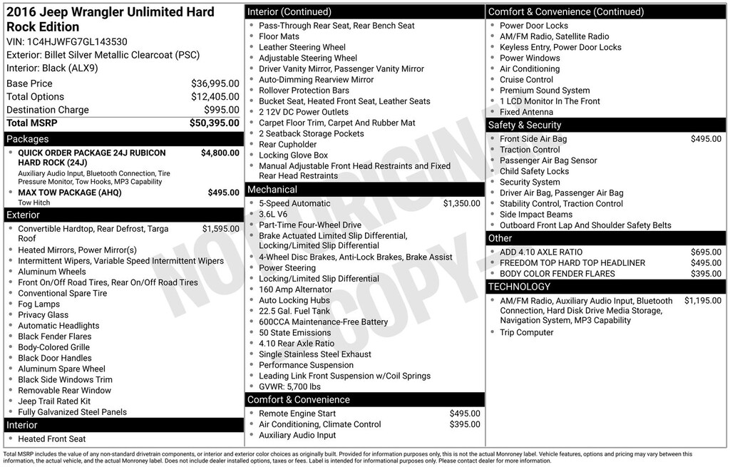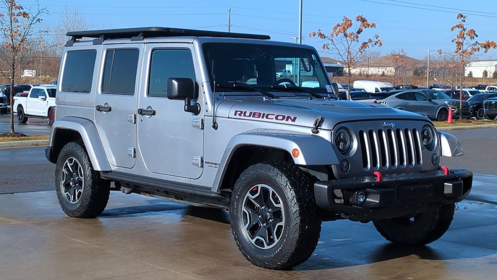 Clean CARFAX. 2016 Jeep Wrangler Unlimited Rubicon Is nicely equipped with Connectivity Group (Leather Wrapped Steering Wheel, Remote USB Port, Tire Pressure Monitoring Display, Uconnect Voice Command w/Bluetooth, and Vehicle Information Center), Max Tow Package (Class II Receiver Hitch and Trailer Tow w/4-Pin Connector Wiring), Quick Order Package 23J Rubicon Hard Rock (Accent Stitching, Alpine 9-Speaker w/All Weather Subwoofer, Black/Chrome Screws Fuel Filler Door, Chrome/Leather Wrapped Shift Knob, Hood w/Power Dome, Jeep Trail Rated Kit, Leather Trimmed Bucket Seats, Low Gloss Black Wrangler Decal, MOPAR Slush Mats, Premium Black Sunrider Soft Top, Premium EVIC Message Center, Red Front & Rear Tow Hooks, Red Trail Rated Badge, Rubicon Hood Decal, Silver Interior Accents, Steel Front Bumper, Steel Rear Bumper, Wheels: 17" x 7.5" Polished Semi-Gloss Black, Driver Height Adjuster Seat, Front Seat Back Map Pockets, and Heated Front Seats), Quick Order Package 24J Rubicon Hard Rock, Rubicon Hard Rock Package, 40GB Hard Drive w/28GB Available, 5-Year SiriusXM Travel Link Service, 6.5" Touchscreen Display, Audio Jack Input for Mobile Devices, Body Color 3-Piece Hard Top, Freedom Panel Storage Bag, GPS Navigation, Radio: 430N, Rear Window Defroster, Rear Window Wiper/Washer, SiriusXM Travel Link, 17" x 7.5" Polished Mineral Gray Wheels, 4-Wheel Disc Brakes, 4.10 Rear Axle Ratio, 8 Speakers, ABS brakes, Add 4.10 Axle Ratio, Air Conditioning, Air Conditioning w/Auto Temperature Control, Air Filtering, Alloy wheels, AM/FM radio: SiriusXM, Auto-dimming Rear-View mirror, Body Color Fender Flares, Brake assist, CD player, Cloth Seats w/Adjustable Head Restraints, Compass, Driver door bin, Driver vanity mirror, Dual front impact airbags, Electronic Stability Control, Freedom Top Hard Top Headliner, Front anti-roll bar, Front Bucket Seats, Front Center Armrest w/Storage, Front fog lights, Front reading lights, Fully automatic headlights, Heated door mirrors, Humidity Sensor, Illuminated entry, Integrated roll-over protection, Leather steering wheel, Low tire pressure warning, Occupant sensing airbag, Outside temperature display, Panic alarm, Passenger door bin, Passenger vanity mirror, Performance Suspension, Power door mirrors, Power steering, Power windows, Radio data system, Radio: 130, Rear anti-roll bar, Remote keyless entry, Remote Start System, Security system, Speed control, Split folding rear seat, Steering wheel mounted audio controls, Supplemental Front Seat Side Airbags, Tachometer, Tilt steering wheel, Traction control, Trip computer, and Variably intermittent wipers.