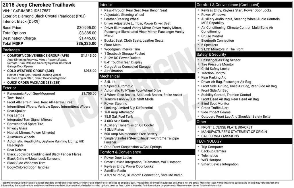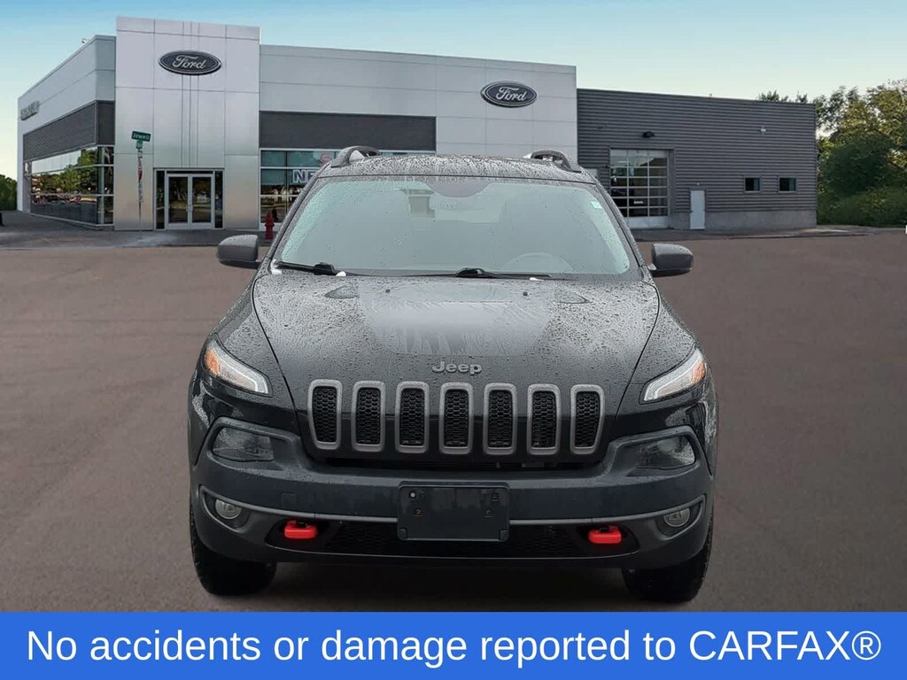 Diamond Black Crystal Pearlcoat 2018 Jeep Cherokee Trailhawk 4WD 9-Speed Automatic 2.4L I4 MultiAir Clean CarFax, CarFax One Owner Vehicle, AM/FM Radio: SiriusXM, Auto-Dimming Rear-View Mirror, Automatic Temperature Control, Cold Weather Group, Comfort/Convenience Group, Engine Block Heater, Front Dual Zone A/C, Fully Automatic Headlights, Heated Front Seats, Heated Steering Wheel, Jeep Rack Off Road Accessory Kit, Power Driver Seat, Power Front/Fixed Rear Full Sunroof, Power Liftgate, Quick Order Package 23E, Radio: Uconnect 3C w/8.4 Display, Rear Window Defroster, Remote Keyless Entry, Remote Start System, Security Alarm, Universal Garage Door Opener, Windshield Wiper De-Icer.