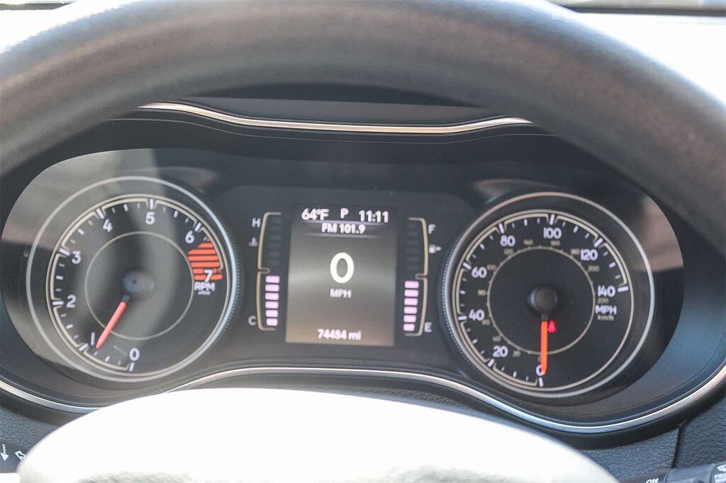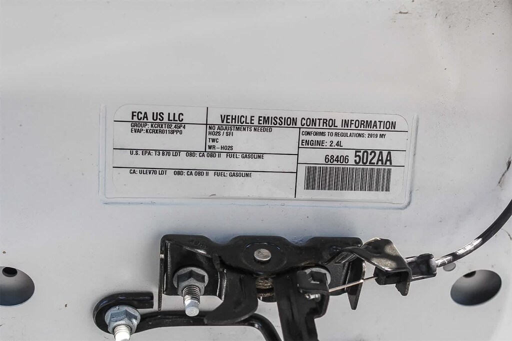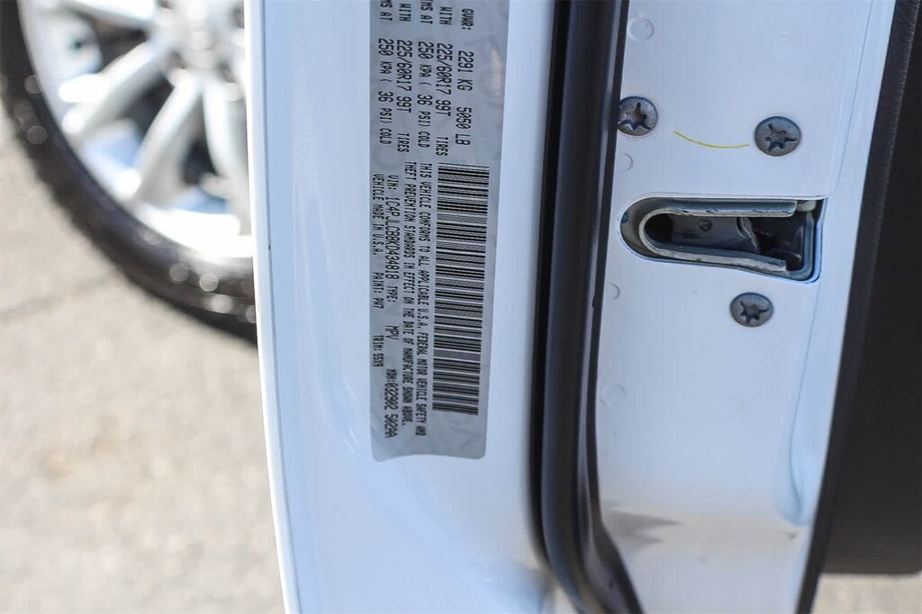 17 x 7 Painted Aluminum Wheels, 3.734 Axle Ratio, 4-Wheel Disc Brakes, 6 Speakers, ABS brakes, Air Conditioning, AM/FM radio, Anti-whiplash front head restraints, Apple CarPlay/Android Auto, Brake assist, Bumpers: body-color, Cloth Bucket Seats, Compass, Deep Tint Sunscreen Glass, Delay-off headlights, Driver door bin, Driver vanity mirror, Dual front impact airbags, Dual front side impact airbags, Electronic Stability Control, Four wheel independent suspension, Front anti-roll bar, Front Bucket Seats, Front Center Armrest, Front fog lights, Front reading lights, Fully automatic headlights, Heated door mirrors, Illuminated entry, Knee airbag, Low tire pressure warning, Normal Duty Suspension, Occupant sensing airbag, Outside temperature display, Overhead airbag, Overhead console, Panic alarm, ParkView Rear Back-Up Camera, Passenger door bin, Passenger vanity mirror, Popular Appearance Group, Power door mirrors, Power steering, Power windows, Quick Order Package 2BJ, Radio data system, Radio: Uconnect 4 w/7 Display, Rear anti-roll bar, Rear reading lights, Rear seat center armrest, Rear side impact airbag, Rear window defroster, Rear window wiper, Remote keyless entry, Roof rack: rails only, Speed control, Speed-sensing steering, Split folding rear seat, Spoiler, Stop-Start Multiple VSM System, Tachometer, Telescoping steering wheel, Tilt steering wheel, Traction control, Trip computer, Variably intermittent wipers, Voltmeter.