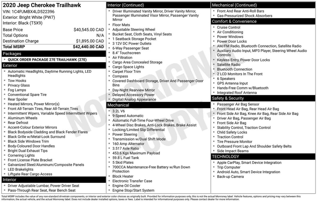 Bright White Clearcoat 2020 Jeep Cherokee Trailhawk 4WD 9-Speed 948TE Automatic 3.2L V6 AM/FM Radio: SiriusXM, Apple CarPlay/Android Auto, Automatic Temperature Control, Front Dual Zone A/C, Fully Automatic Headlights, Heated External Mirrors, ParkView Rear Back-Up Camera, Power Driver Seat, Quick Order Package 27E Trailhawk, Radio: Uconnect 4 w/8.4 Display, Rear Window Defroster, Remote Keyless Entry, Wheels: 17 x 7.5 Painted Diamond Cut Aluminum.