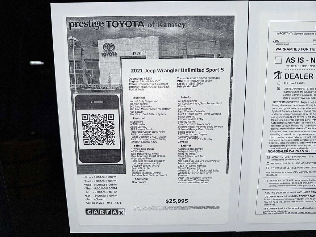 Wrangler Unlimited Sport S, 4D Sport Utility, 3.6L V6 24V VVT, 8-Speed Automatic, 4WD, Firecracker Red Clearcoat, 240 Amp Alternator, 7 & 4 Pin Wiring Harness, 7.0 Touchscreen Display, 700 Amp Maintenance Free Battery, Air Conditioning w/Auto Temperature Control, Air Filtering, Apple CarPlay, Automatic Headlamps, Auxiliary Switches, Class II Receiver Hitch, Cluster 7.0 TFT Color Display, Cold Weather Group, Convenience Group, Deep Tint Sunscreen Windows, For More Info, Call 800-643-2112, Front 1-Touch Down Power Windows, Google Android Auto, GPS Antenna Input, Heated Front Seats, Heated Steering Wheel, Integrated Center Stack Radio, Leather Wrapped Steering Wheel, Power Heated Mirrors, Quick Order Package 25S Sport S, Radio: Uconnect 4 w/7 Display, Remote Keyless Entry, Security Alarm, SiriusXM Radio Service, SiriusXM Satellite Radio, Speed Sensitive Power Locks, Sport S, Sun Visors w/Illuminated Vanity Mirrors, Technology Group, Trailer Tow & HD Electrical Group, Universal Garage Door Opener, USB Host Flip, Wheels: 17 x 7.5 Tech Silver Aluminum. Clean CARFAX. CARFAX One-Owner. Firecracker Red Clearcoat 2021 Jeep Wrangler Unlimited Sport S 4WD 8-Speed Automatic 3.6L V6 24V VVT
