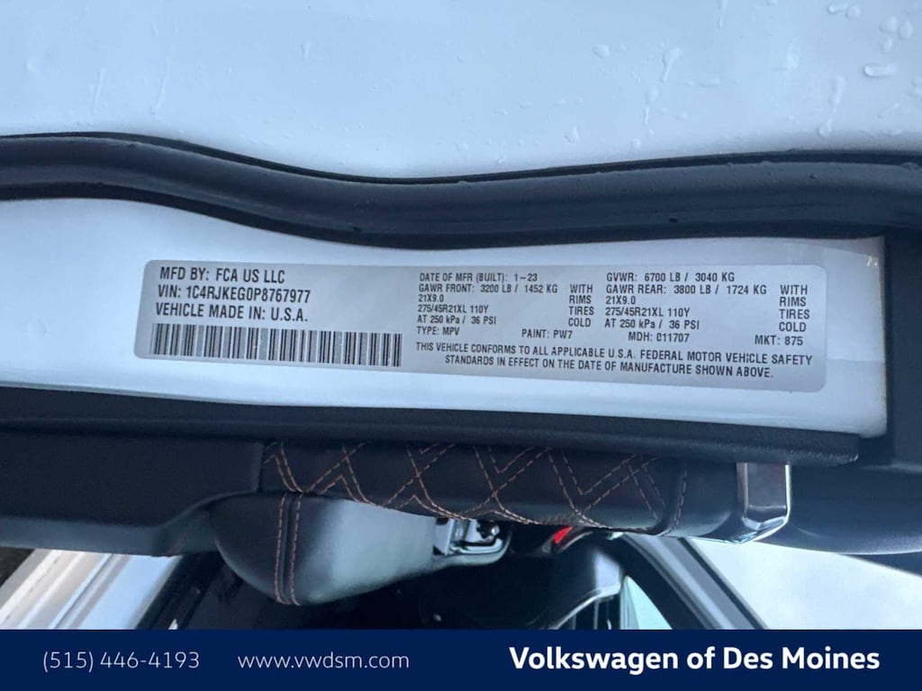Clean CARFAX. CARFAX One-Owner. Bright White Clearcoat 2023 Jeep Grand Cherokee L Summit 4WD 8-Speed Automatic 3.6L V6 24V VVT CARFAX One-owner*, Clean CARFAX report*, Navigation, Apple Car Play/Android Auto*, 2nd Row Manual Window Shades, Active Cruise Control, Adaptive suspension, Auto-leveling suspension, Gloss Black Exterior Accents, Gloss Black Roof Rails, Heated front seats, Heated rear seats, High Altitude Package, Luxury Tech Group V, Memory seat, Nappa Leather Seats, Neutral Gray Exterior Accents, Painted Door Cladding, Power driver seat, Power Liftgate, Power moonroof, Ventilated front seats, Wheels: 21 x 9 Black Painted Aluminum, Wireless Charging Pad.