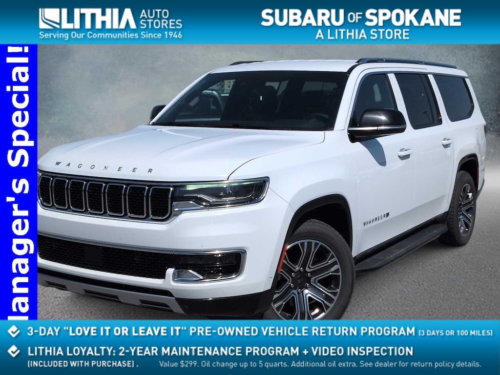 CARFAX One-Owner. Bright White Clearcoat 2023 Jeep Wagoneer L Series II 4WD 8-Speed Automatic 3.0L I6 10 Speakers, 3.55 Rear Axle Ratio, 3rd row seats: bench, 4-Wheel Disc Brakes, ABS brakes, Adjustable pedals, Air Conditioning, Alloy wheels, AM/FM radio: SiriusXM with 360L, Anti-whiplash front head restraints, Audio memory, Auto-dimming door mirrors, Auto-dimming Rear-View mirror, Auto-leveling suspension, Automatic temperature control, Brake assist, Bumpers: body-color, Compass, Delay-off headlights, Driver door bin, Driver vanity mirror, Drivers Seat Mounted Armrest, Dual front impact airbags, Dual front side impact airbags, Electronic Stability Control, Emergency communication system: Automatic SOS Call, Exterior Parking Camera Rear, Four wheel independent suspension, Front anti-roll bar, Front Bucket Seats, Front Center Armrest w/Storage, Front dual zone A/C, Front fog lights, Front reading lights, Fully automatic headlights, Garage door transmitter, Genuine wood console insert, Genuine wood dashboard insert, Genuine wood door panel insert, Heated door mirrors, Heated front seats, Heated steering wheel, Illuminated entry, Knee airbag, Leather Trimmed Bucket Seats, Low tire pressure warning, Memory seat, Navigation System, Normal Duty Suspension, Occupant sensing airbag, Outside temperature display, Overhead airbag, Overhead console, Panic alarm, Passenger door bin, Passenger seat mounted armrest, Passenger vanity mirror, Pedal memory, Power adjustable front head restraints, Power door mirrors, Power driver seat, Power Liftgate, Power passenger seat, Power steering, Power windows, Radio data system, Radio: Uconnect 5 Nav w/10.1 Display, Rain sensing wipers, Rear air conditioning, Rear anti-roll bar, Rear reading lights, Rear seat center armrest, Rear window defroster, Rear window wiper, Reclining 3rd row seat, Remote keyless entry, Security system, Speed control, Speed-sensing steering, Speed-Sensitive Wipers, Split folding rear seat, Steering wheel memory, Steering wheel mounted audio controls, Tachometer, Telescoping steering wheel, Tilt steering wheel, Traction control, Trip computer, Turn signal indicator mirrors, Variably intermittent wipers, Ventilated front seats, Voltmeter, Wheels: 20 x 9.0 Premium 2 Aluminum.
