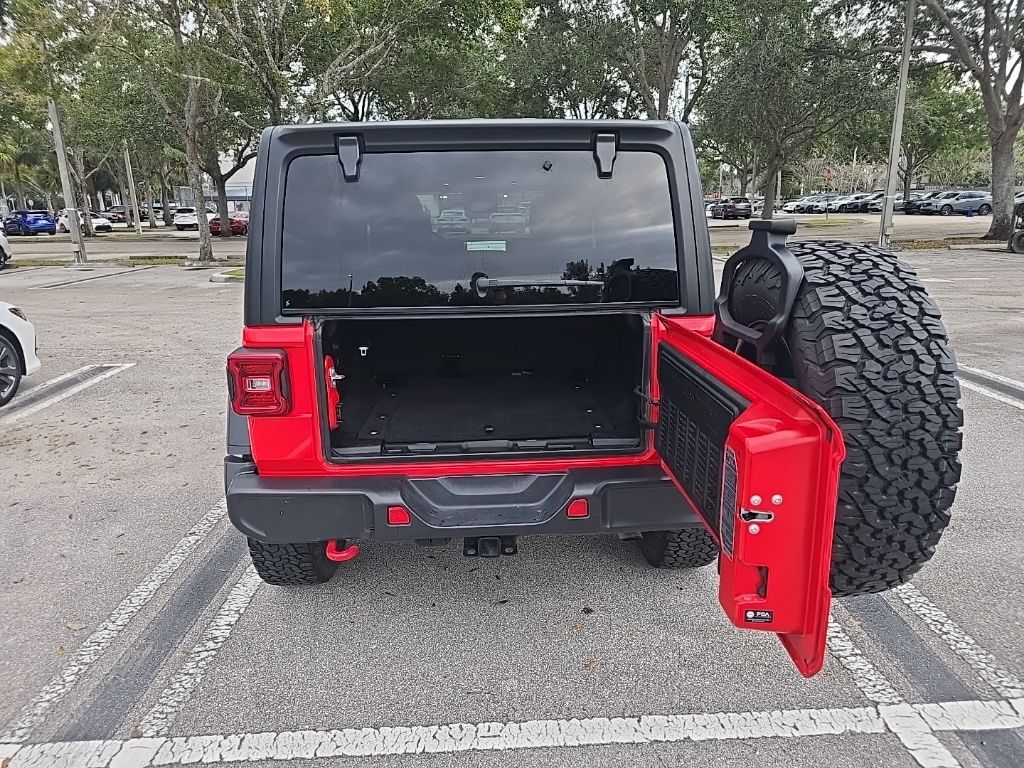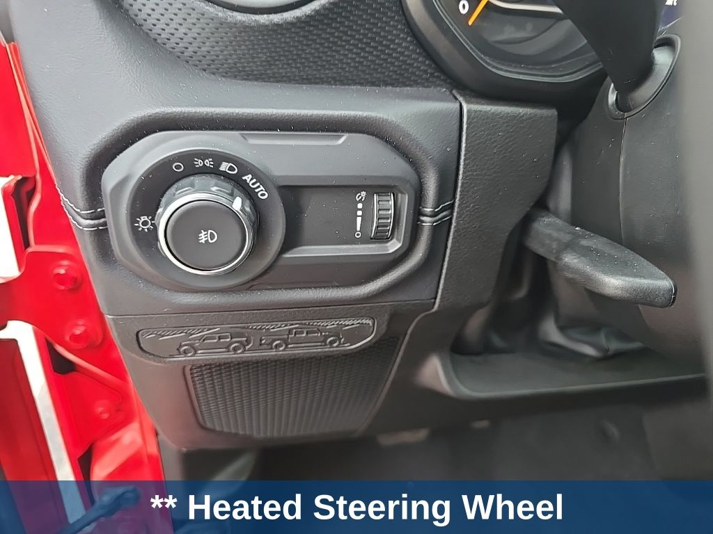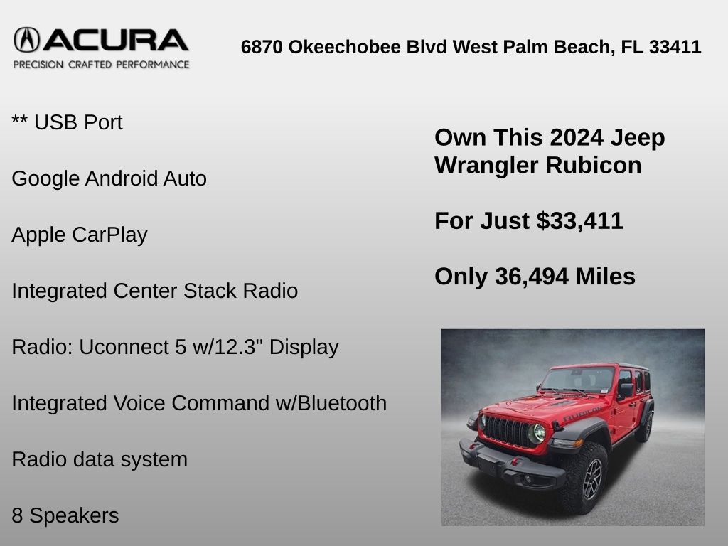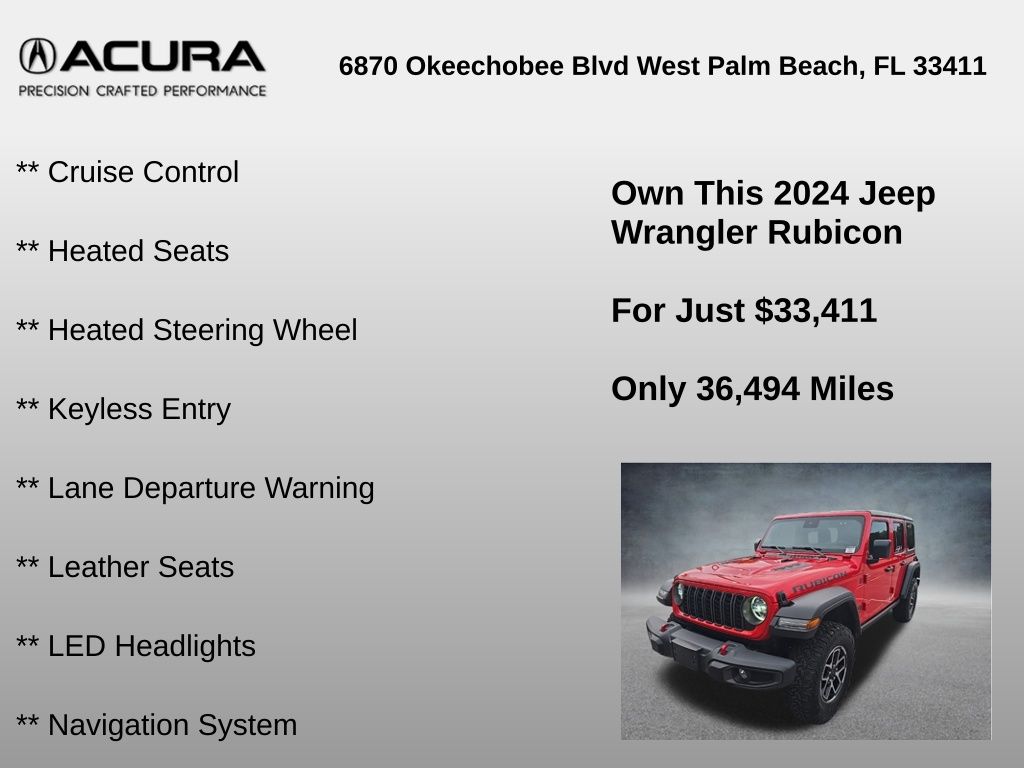 ** Adaptive cruise control, ** Alloy Wheels / Premium Wheels, ** Apple CarPlay/Android Auto, ** Backup Camera, ** Blind Spot Monitor, ** Bluetooth, Hands-Free, ** Brake Assist, ** Cruise Control, ** Heated Seats, ** Heated Steering Wheel, ** Keyless Entry, ** Lane Departure Warning, ** Leather Seats, ** LED Headlights, ** Navigation System, ** Premium Sound System / DVD Player, ** Rear Cross Traffic Alert, ** Roof Rack, ** Satellite Radio, ** Security System, ** Stability Control, ** Steering Wheel Controls, ** Tow Hitch / Trailer Hitch, ** USB Port, Wrangler Rubicon, 4D Sport Utility, 3.6L V6 24V VVT, 8-Speed Automatic, 4WD, Firecracker Red Clearcoat, Black Cloth, 12.3" Touchscreen Display, 4-Wheel Disc Brakes, 4.10 Rear Axle Ratio, 8 Speakers, 97 MPH Vehicle Max Speed Calibration, ABS brakes, Air Conditioning, Alloy wheels, AM/FM radio: SiriusXM, Apple CarPlay, Apple CarPlay/Android Auto, Automatic temperature control, Aux Battery, Black 3-Piece Hard Top, Brake assist, Cloth Low-Back Bucket Seats, Compass, Connectivity - US/Canada, Delay-off headlights, Disassociated Touchscreen Display, Driver door bin, Driver vanity mirror, Dual front impact airbags, Dual front side impact airbags, Electronic Stability Control, Emergency communication system: Jeep Connect, Freedom Panel Storage Bag, Front anti-roll bar, Front Bucket Seats, Front Center Armrest w/Storage, Front dual zone A/C, Front fog lights, Front License Plate Bracket, Front reading lights, Fully automatic headlights, Google Android Auto, Heated door mirrors, Illuminated entry, Integrated Center Stack Radio, Integrated roll-over protection, Integrated Voice Command w/Bluetooth, Low tire pressure warning, No Soft Top, Non-Lock Fuel Cap w/o Discriminator, Occupant sensing airbag, Outside temperature display, Overhead airbag, Panic alarm, ParkView Rear Back-Up Camera, Passenger door bin, Passenger vanity mirror, Performance Suspension, Power door mirrors, Power steering, Power windows, Quick Order Package 24R Rubicon, Radio data system, Radio: Uconnect 5 w/12.3" Display, Rear anti-roll bar, Rear reading lights, Rear Window Defroster, Rear Window Wiper/Washer, Remote keyless entry, Security system, Speed control, Split folding rear seat, Steering wheel mounted audio controls, Stop-Start Dual Battery System, Tachometer, Telescoping steering wheel, Tilt steering wheel, Traction control, Trip computer, Variably intermittent wipers, Voltmeter, Wheels: 17" x 7.5" Machined/Painted Black.