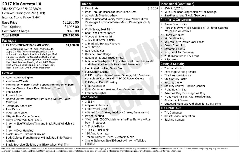 Remington Red Metallic 2017 Kia Sorento LX FWD 6-Speed Automatic with Sportmatic 2.4L DOHC AM/FM Radio: SiriusXM, Auto Headlamp Control, Auto-Dimming Rear-View Mirror, Dual Zone Automatic HVAC, Exterior Parking Camera Rear, Heated External Mirrors, Heated Front Bucket Seats, Leather Wrapped Steering Wheel & Gear Shift Knob, LX Convenience Package, Power Door Mirrors, Rear Backup Park Assist, Rear Window Defroster.
