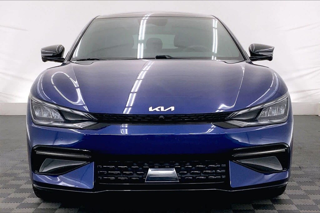 CARFAX One-Owner. Clean CARFAX. Yacht Blue 2023 Kia EV6 GT-Line AWD 1-Speed Automatic Electric Motor 14 Speakers, 4-Wheel Disc Brakes, ABS brakes, Air Conditioning, Alloy wheels, AM/FM radio: SiriusXM, Apple CarPlay & Android Auto, Auto High-beam Headlights, Auto-dimming Rear-View mirror, Automatic temperature control, Axle Ratio: 10.650, Brake assist, Bumpers: body-color, Cargo Mat w/Luggage Board, Cargo Tray w/Luggage Board, Carpet Floor Mats, Delay-off headlights, Driver door bin, Driver vanity mirror, Dual front impact airbags, Dual front side impact airbags, Electronic Stability Control, Emergency communication system, Four wheel independent suspension, Front anti-roll bar, Front Bucket Seats, Front Center Armrest, Front dual zone A/C, Front reading lights, Fully automatic headlights, Garage door transmitter: HomeLink, GT-Line White Seat Package, Heads-Up Display, Heated & Ventilated Front Bucket Seats, Heated door mirrors, Heated front seats, Heated rear seats, Heated steering wheel, Illuminated entry, Knee airbag, Low tire pressure warning, Memory seat, Navigation system: AVN 5.0 Navigation System, Occupant sensing airbag, Outside temperature display, Overhead airbag, Overhead console, Panic alarm, Passenger door bin, Passenger vanity mirror, Power door mirrors, Power driver seat, Power Liftgate, Power moonroof, Power passenger seat, Power steering, Power windows, Radio: Meridian Premium Audio System, Rain sensing wipers, Rear anti-roll bar, Rear seat center armrest, Rear window defroster, Remote keyless entry, Security system, Speed control, Speed-sensing steering, Split folding rear seat, Spoiler, Sport steering wheel, Steering wheel mounted audio controls, Telescoping steering wheel, Tilt steering wheel, Traction control, Trip computer, Turn signal indicator mirrors, Variably intermittent wipers, Vegan Leather Seat Trim, Vegan Leatherette Seat Trim w/Suede Accents, Ventilated front seats, Wheels: 8.0J x 20 Black Painted Alloy, White Seat Color w/Black Accent.
