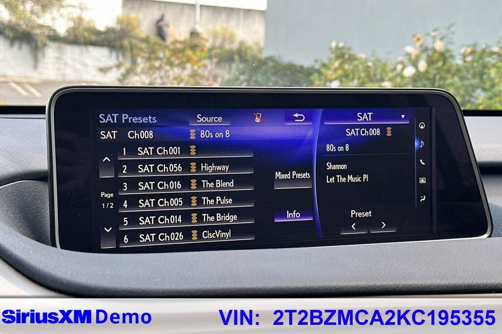 NAVIGATION PACKAGE Lexus Enform Destination Assist, Complimentary for the first year of ownership, Lexus Enform App Suite, Supscription free, destination search, Yelp, iHeartRadio, Slacker Facebook Places, Movietickets.com, OpenTable, Pandora, stocks, fuel prices and sports, Radio: AM/FM/In-Dash CD/DVD Player & Navigation, 12.3-inch screen w/full map, 9-speaker premium audio system, Bluetooth® hands free phone and automatic phonebook download capabilities, Scout GPS link app-based turn-by-turn directions, HD Radio (complimentary traffic and weather), SiriusXM satellite radio (complimentary included), Siri Eyes Free, advanced voice command casual-language voice recognition system, remote touch controller, auxiliary mini jack and two USB ports, POWER TILT & SLIDE MOONROOF roof rail, WHEELS: 20 X 8 SPLIT 5-SPOKE DARK SILVER machined finish, Tires: 235/55R20 AS, PREMIUM PACKAGE drivers seat easy exit (auto away/return), Rear Armrest Storage Compartment, Driver Seat Memory w/3 Settings, Steering Wheel Memory, Wood Door Trim, Power Folding Electrochromic Mirror w/Memory, power fold, auto-dim and memory, BLIND SPOT MONITOR & REAR CROSS TRAFFIC ALERT intelligence clearance and back sonar and lane change assist, Intuitive Parking Assist, HEATED & VENTILATED FRONT SEATS, WOOD & LEATHER HEATED STEERING WHEEL, COLD AREA PACKAGE PTC heater, Headlamp Auto-Leveling, Headlamp Cleaners, Windshield Wiper Deicer, TOUCH-FREE POWER REAR DOOR emblem sensor and easy closer door.