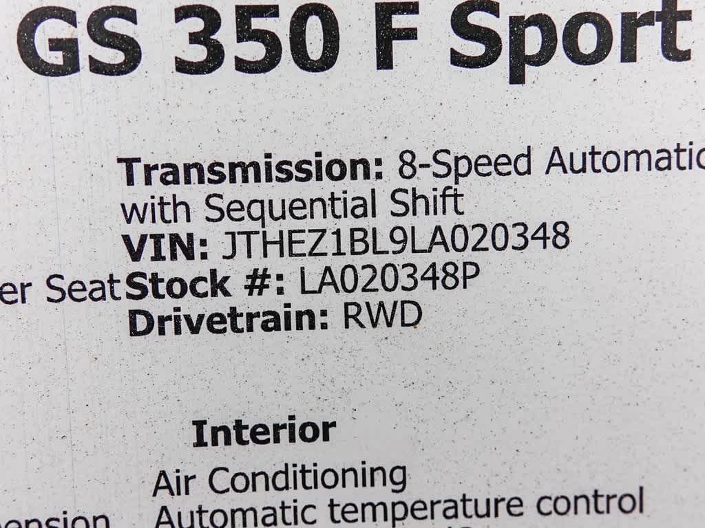 Obsidian 2020 Lexus GS 350 F Sport RWD 8-Speed Automatic with Sequential Shift 3.5L V6 DOHC 24V
