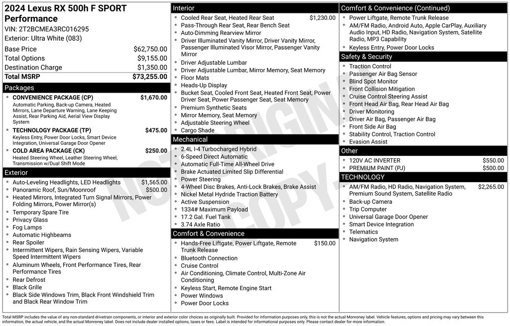 CARFAX One-Owner. Ultra White 2024 Lexus RX 4D Sport Utility 500h F SPORT Performance 2.4L I4 PDI Hybrid Turbocharged DOHC 16V LEV3-SULEV30 274hp AWD 6-Speed Automatic Odometer is 13320 miles below market average!